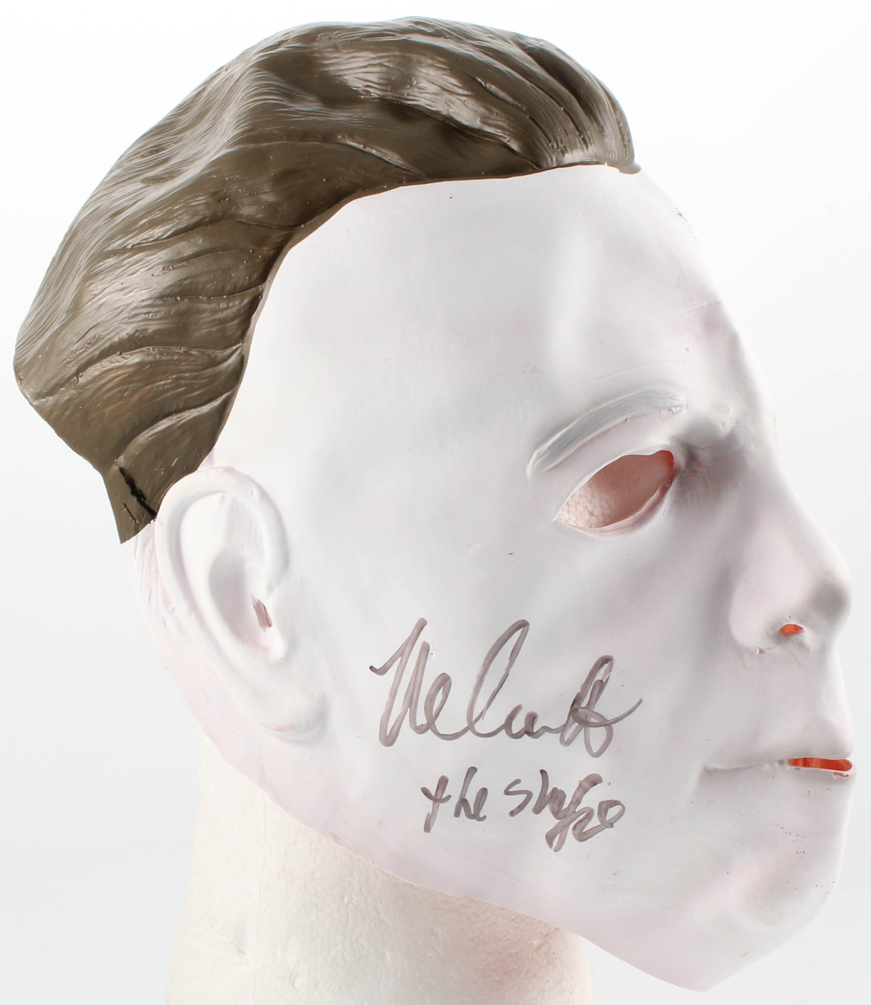 Rubie's full-size Michael Myers mask. Hand-signed and inscribed in black felt-tip pen by Nick Castle. Please note, the mask does not come with the display stand shown.