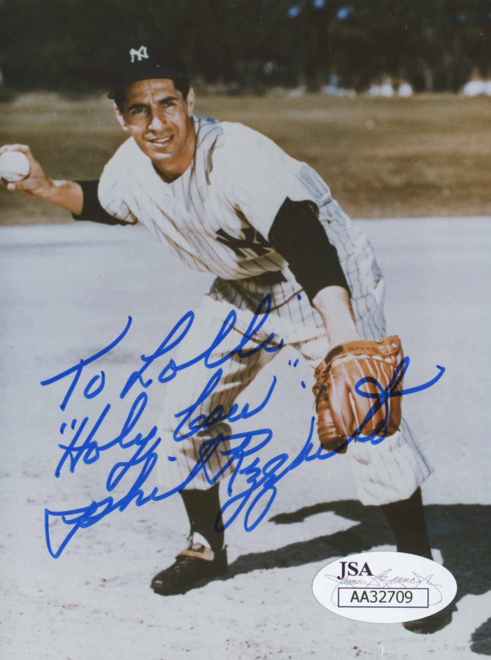 Photo measures 3.5" x 4.5" in size and has been hand-signed and inscribed in blue felt-tip pen by Phil Rizzuto (D. 2007, HOF). Please note, the autograph has been personalized "to Lolli."