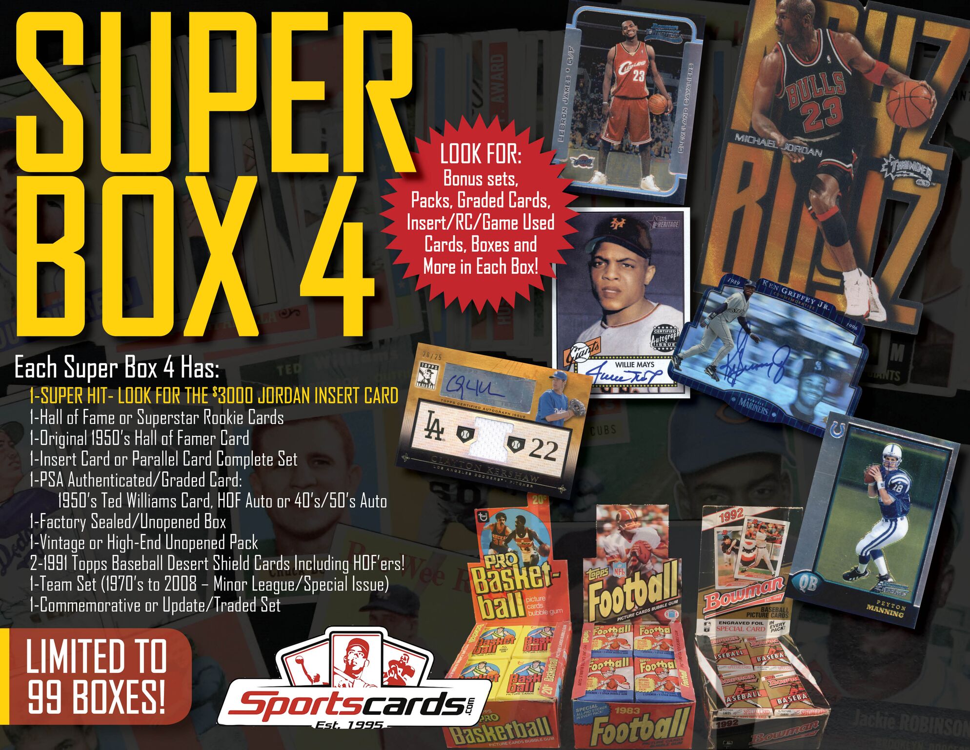 “Super Box 4” is limited to only 99 boxes! Each box is randomly packed with a variety of everything sports cards and tons of great stuff, just check out the list below! All the big names in Baseball, Basketball, Football and Hockey are included in this edition!