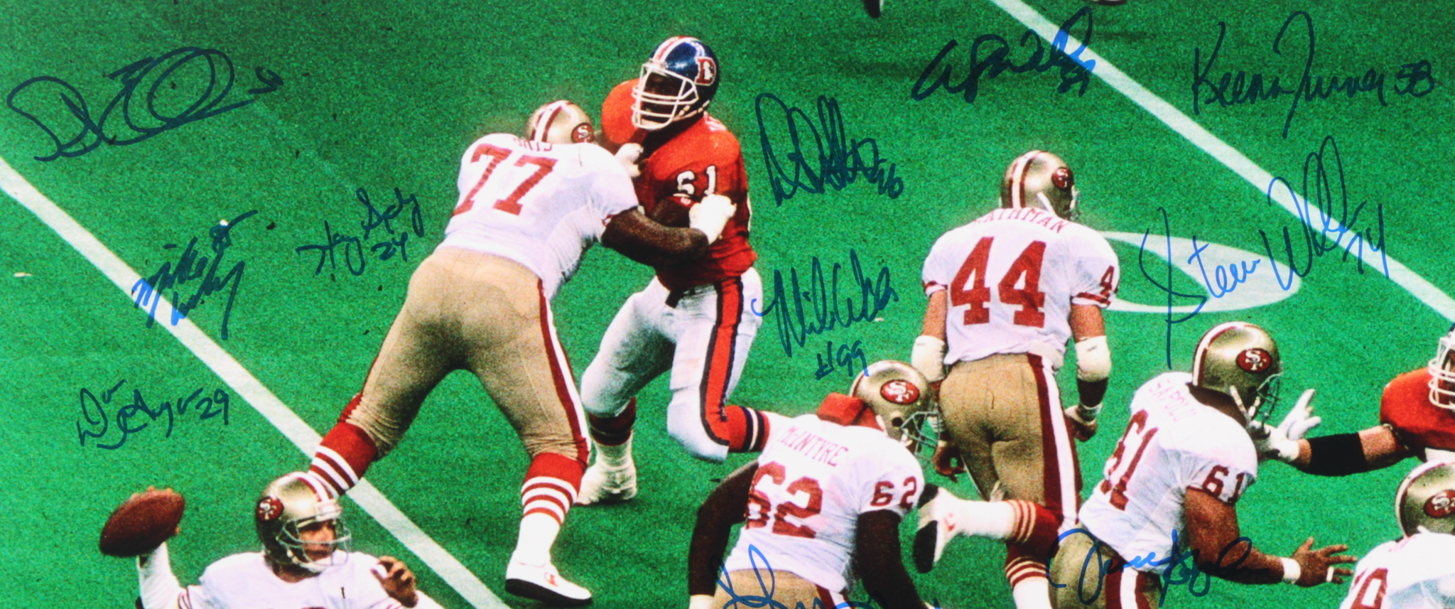 Photo measures 16" x 20" in size and has been hand-signed in blue felt-tip pen by (16) members of the 1989-90 San Francisco 49ers including Bruce Collie, Keena Turner, Darryl Pollard, Wesley Walls, Steve Wallace, Mike Walter, Don Griffin, Harry Sydney, Kevin Fagan, and (7) others.