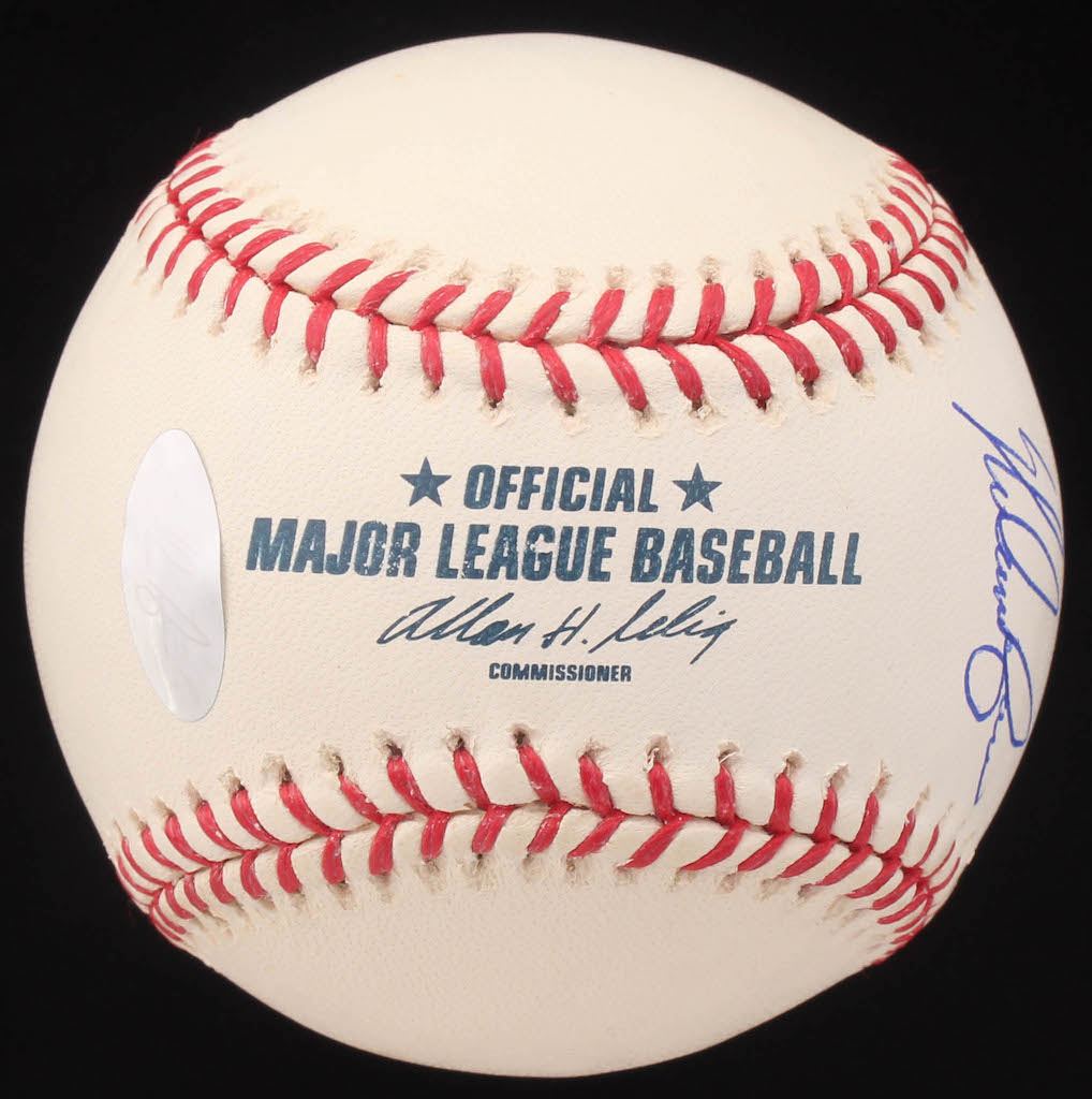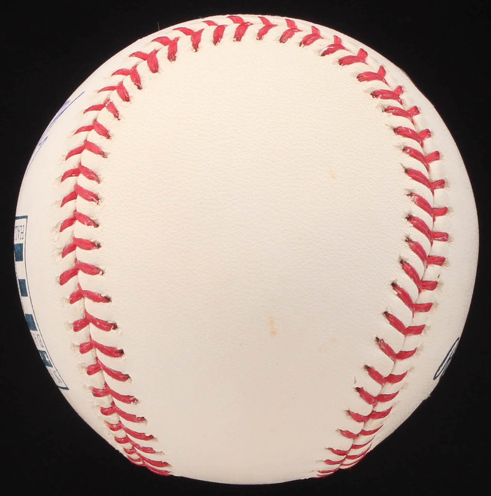 Rawlings Hall of Fame logo baseball. Hand-signed in blue ink pen by Nolan Ryan (Astros, HOF). Please note, the baseball shows signs of natural toning.