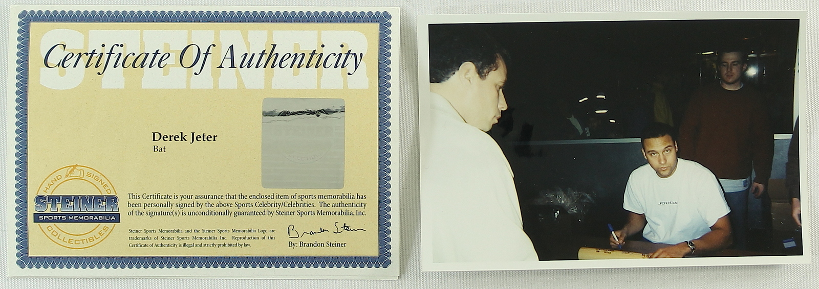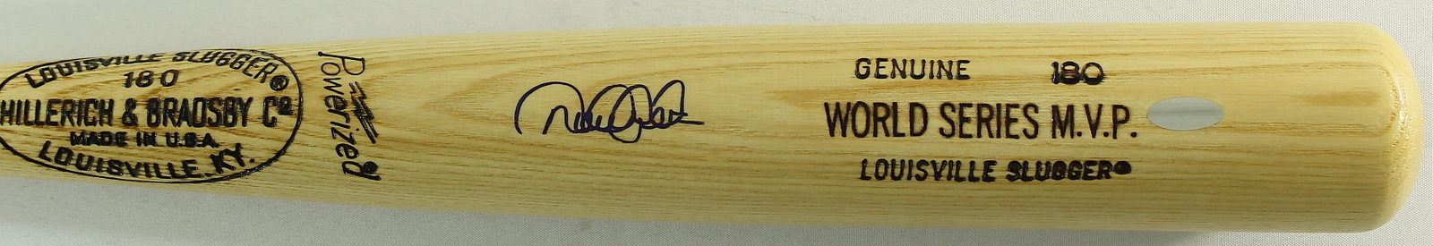 Hillerich & Bradsby Co. Louisville Slugger World Series MVP baseball bat. Hand-signed in blue felt-tip pen by Derek Jeter (Yankees). The autograph includes an official Steiner hologram and matching COA for authenticity purposes.