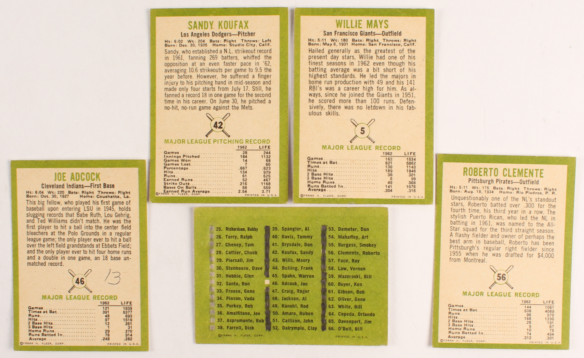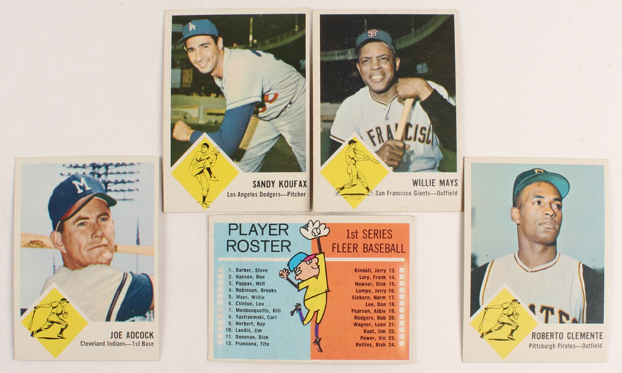 Complete Set of (67) 1963 Fleer Baseball Cards with Checklist, #5 Willie Mays, #42 Sandy Koufax, #56 Roberto Clemente, #46 Joe Adcock