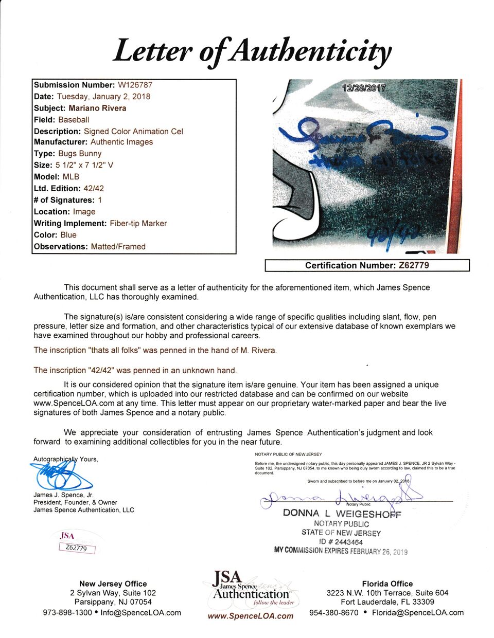 Custom framed animation cel display measures 10" x 15" in size and has been hand-signed and inscribed in blue felt-tip pen by Mariano Rivera. Please note, the animation cel is limited edition and has been hand-numbered #42/42.