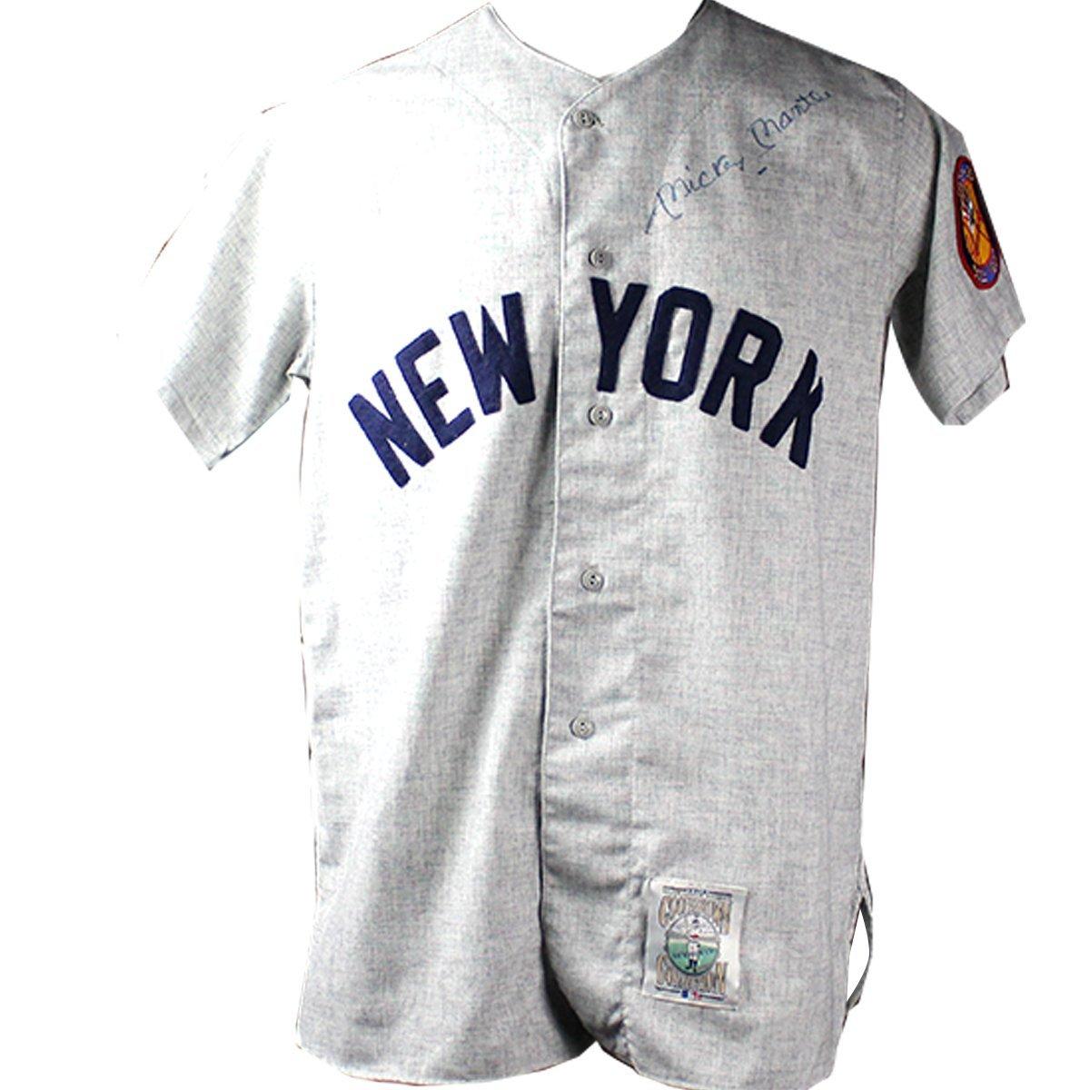Mitchell & Ness on-field style 1952 New York Yankees jersey. Hand-signed in blue felt-tip pen by Mickey Mantle (D. 1995, HOF).