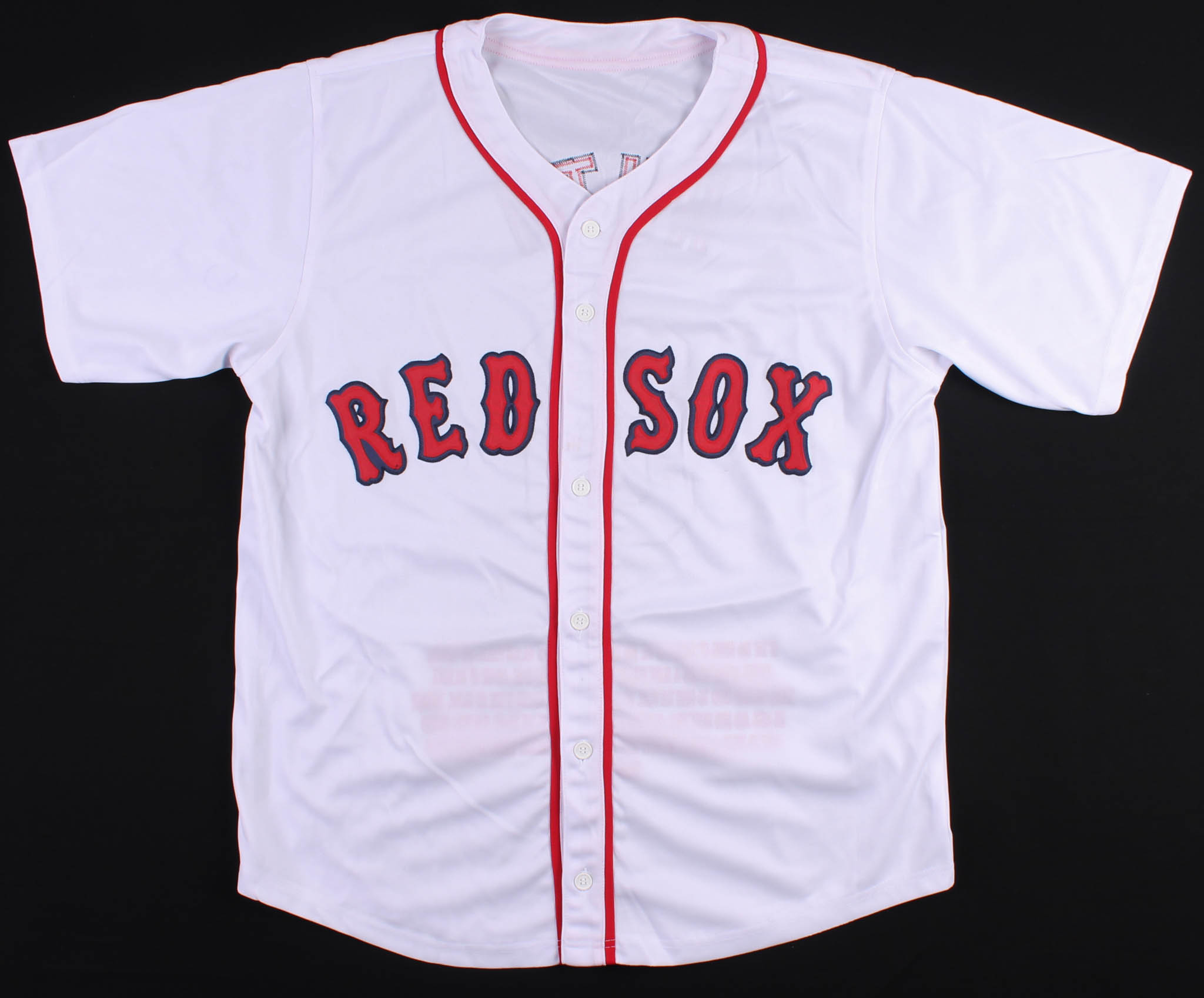 Custom on-field style jersey, everything is sewn on, size XL. Hand-signed and inscribed in silver paint pen by Bill Buckner and Mookie Wilson. 1986 World Series Game 6 stats are custom stitched into the jersey below the reverse numbers.