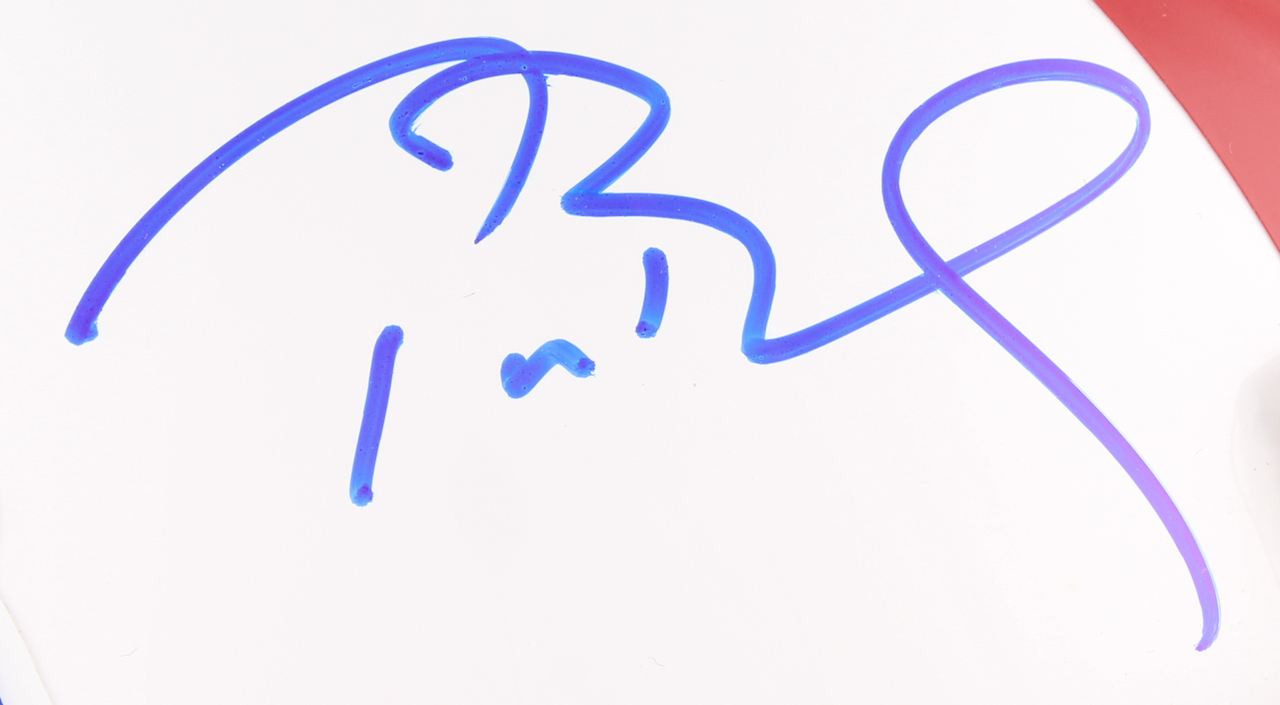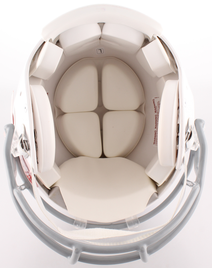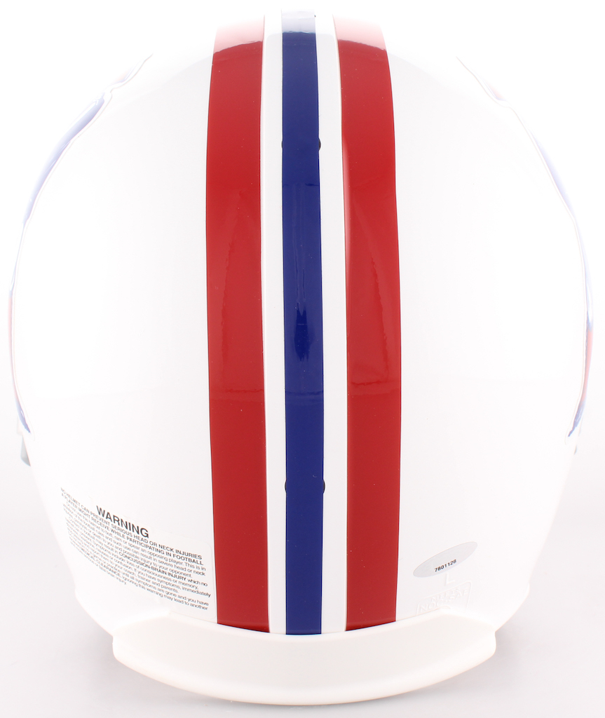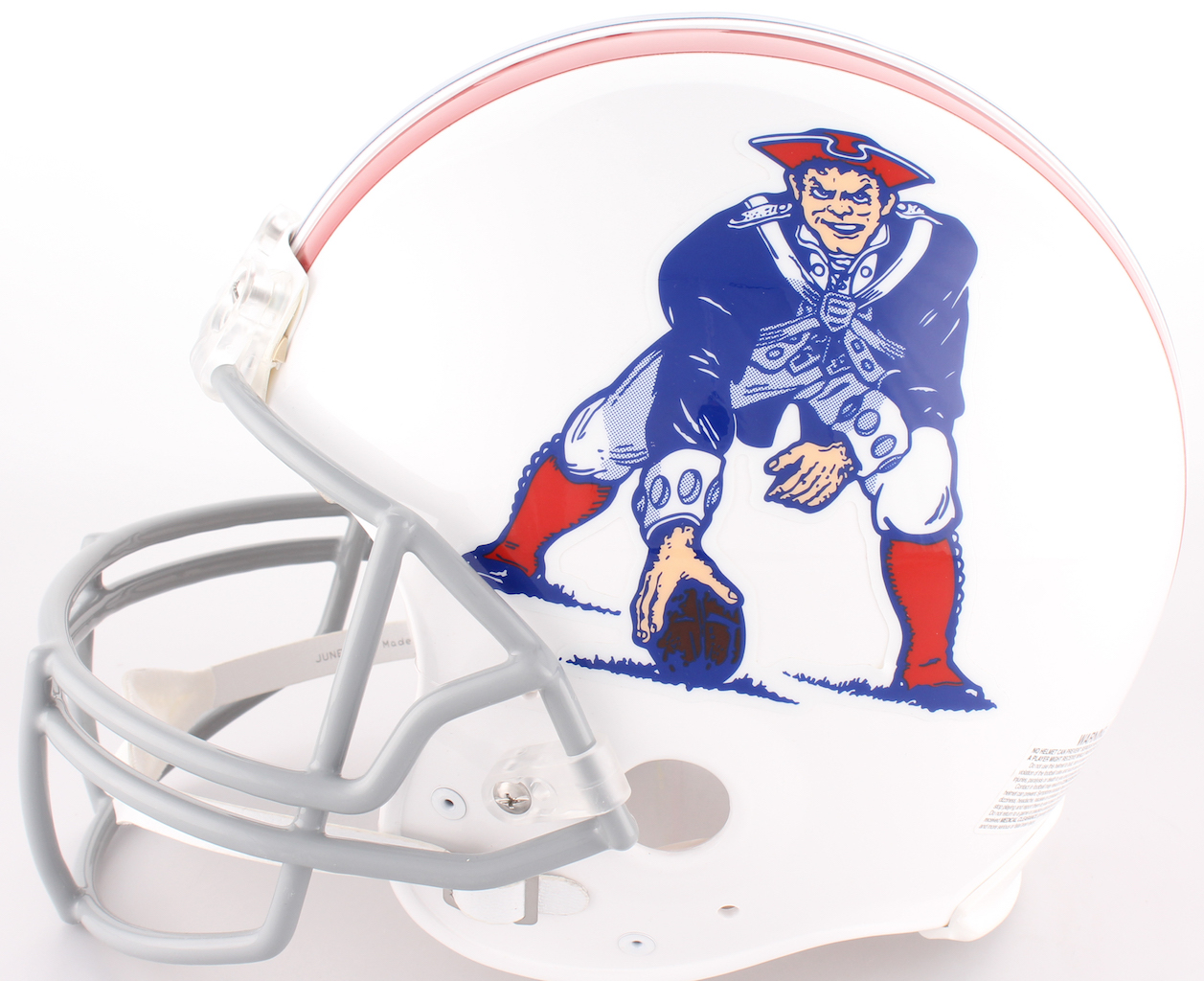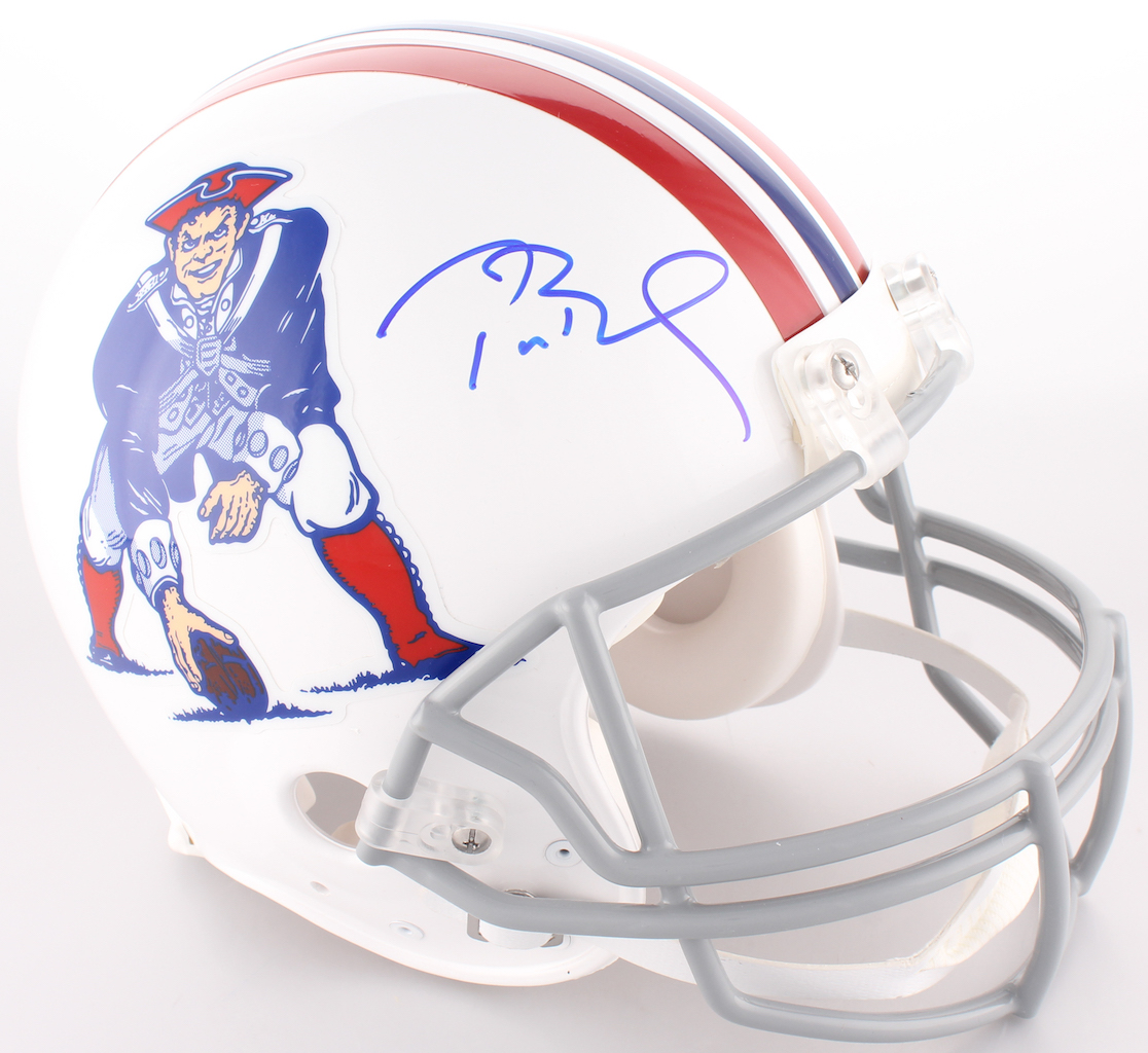 Riddell New England Patriots full-size on-field throwback helmet. Hand-signed in blue felt-tip pen by Tom Brady.