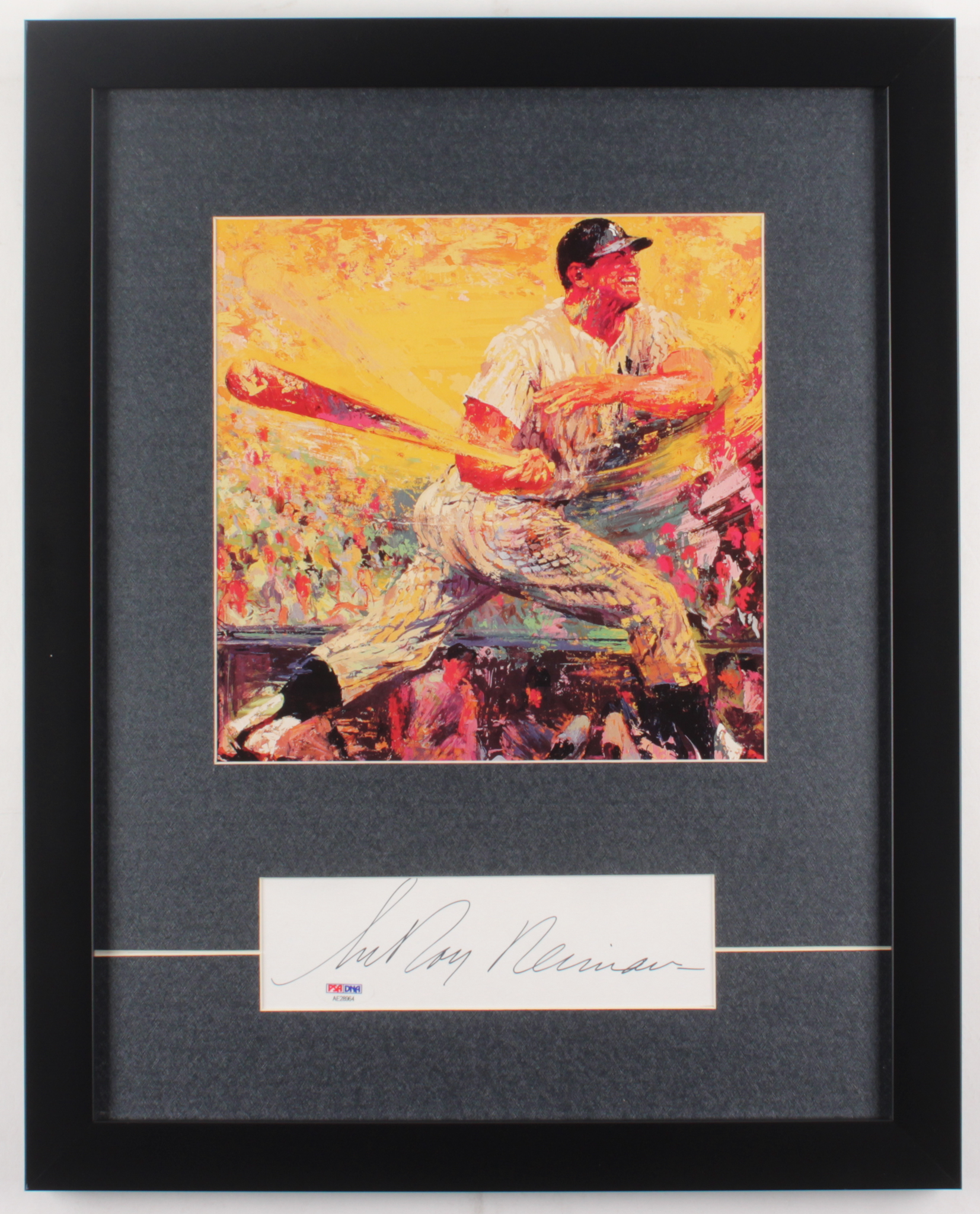 Custom framed measures 16" x 20" in size and features a cut that has been hand-signed in black felt-tip pen by LeRoy Neiman (D. 2012). The display also features a Neiman print of Mickey Mantle.