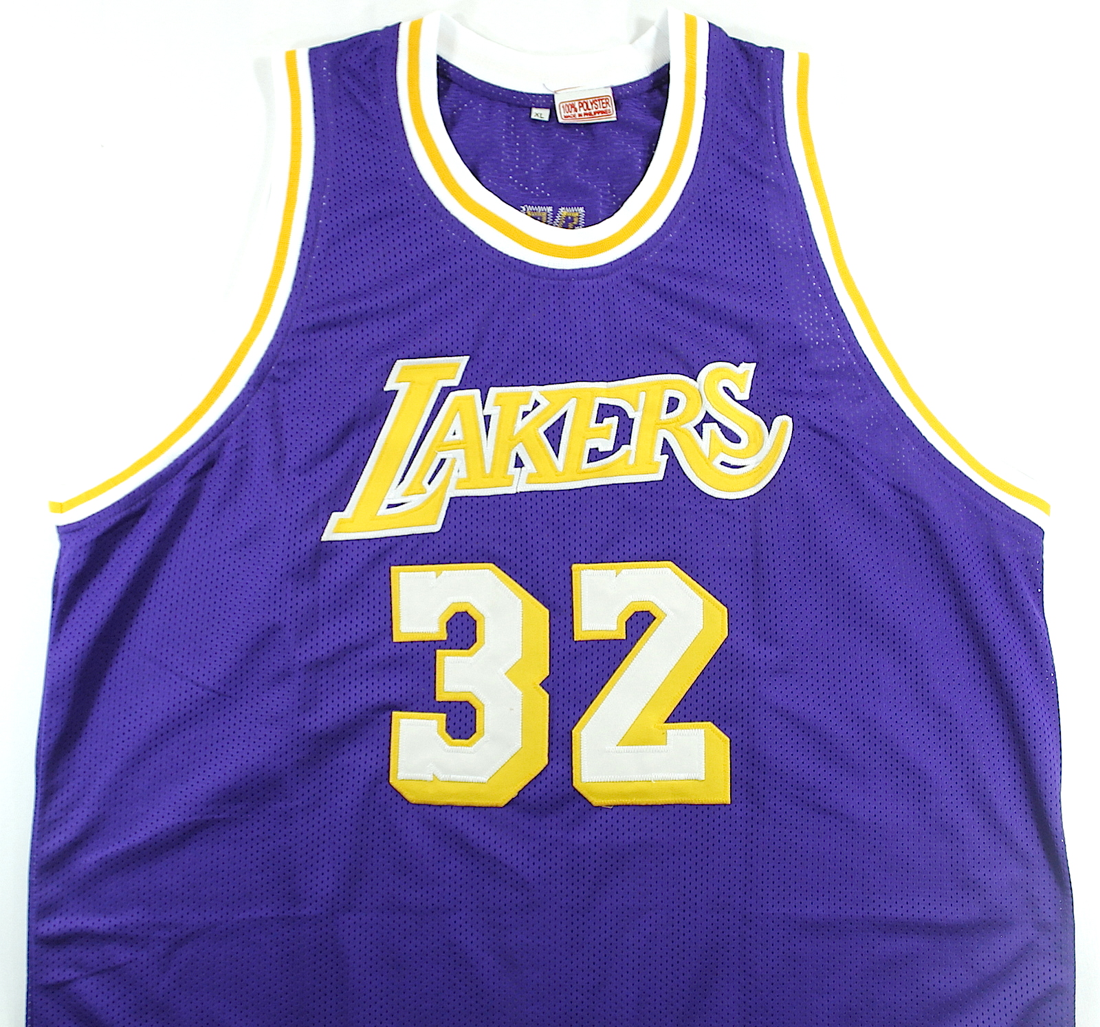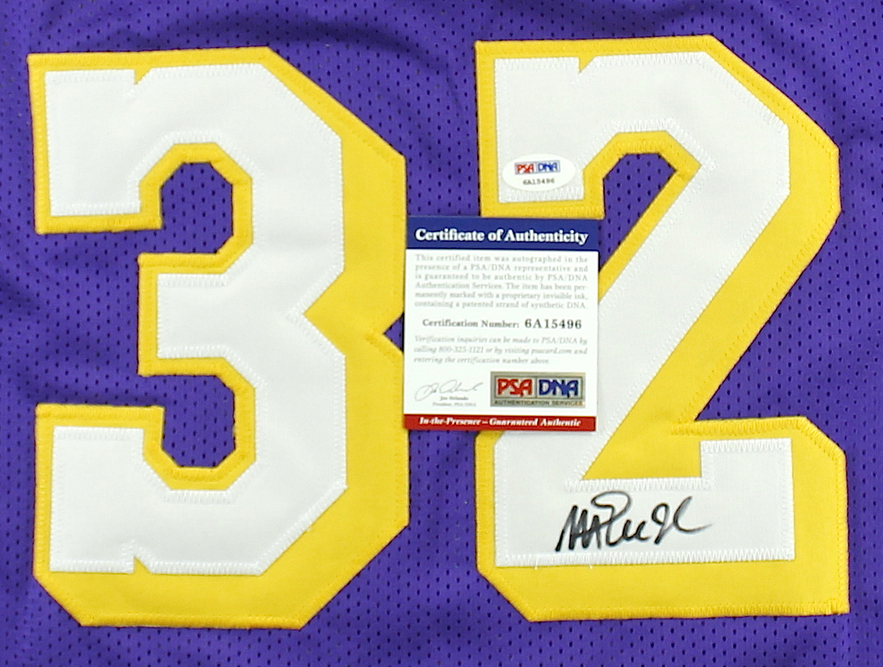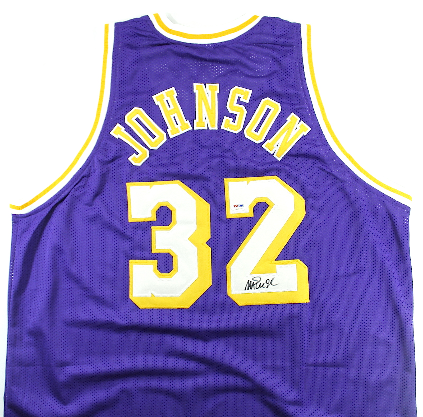 Custom on-court style jersey. Everything is sewn on, size XL. Hand-signed in black felt tip pen by Magic Johnson (Lakers HOF). The autograph includes an official PSA/DNA hologram and matching COA for authenticity purposes. The signing of the jersey was witnessed by PSA.
