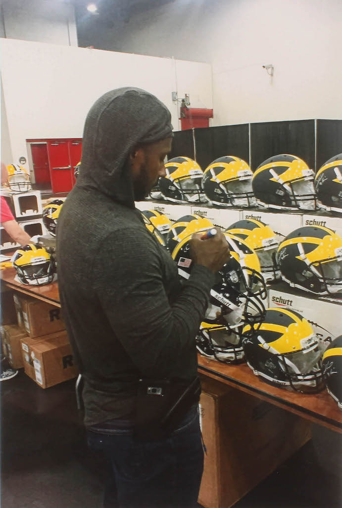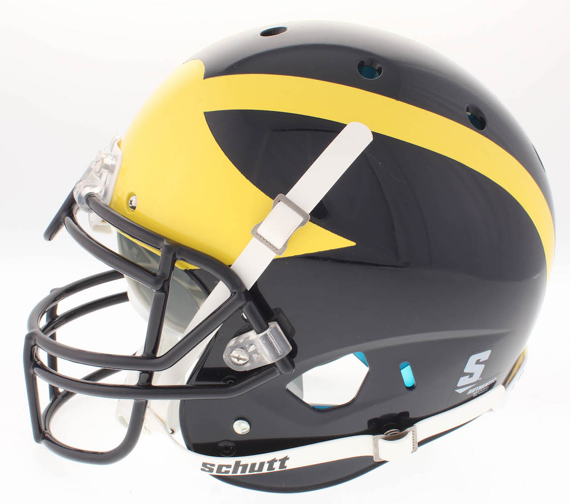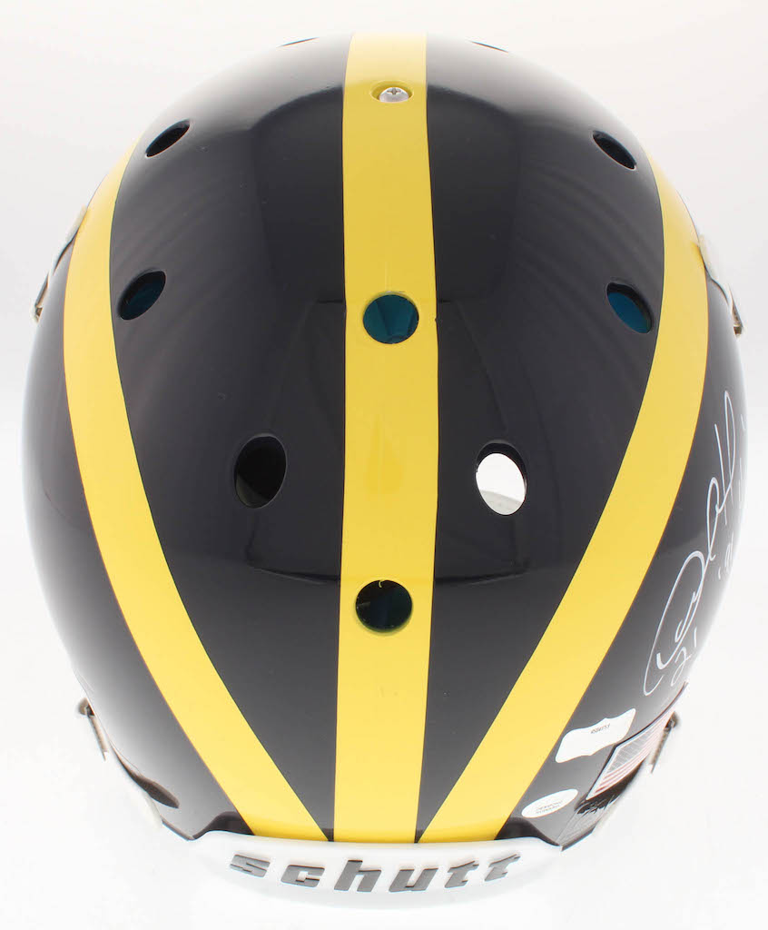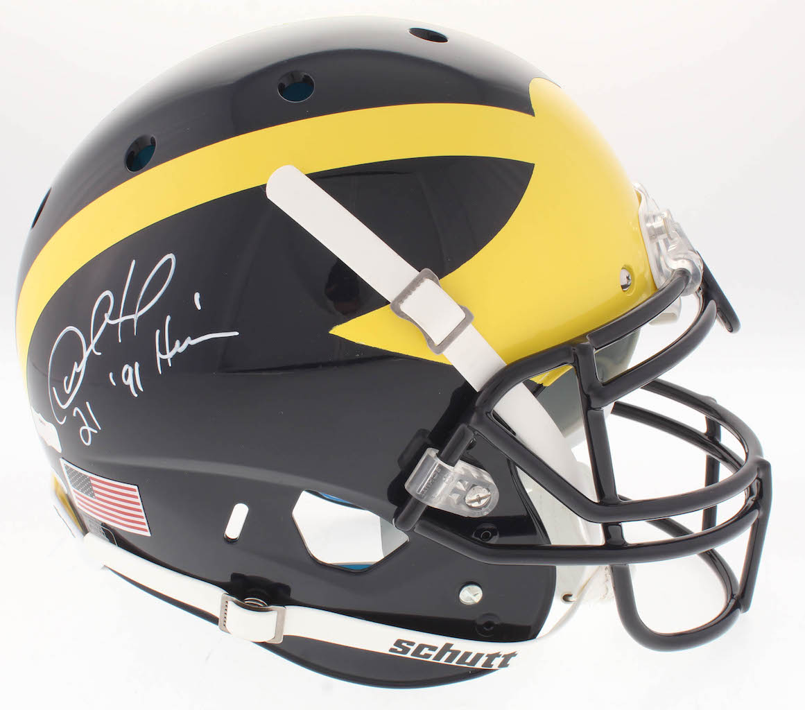 Schutt Michigan Wolverines full-size on-field authentic helmet. Hand-signed and inscribed in white paint pen by Desmond Howard.