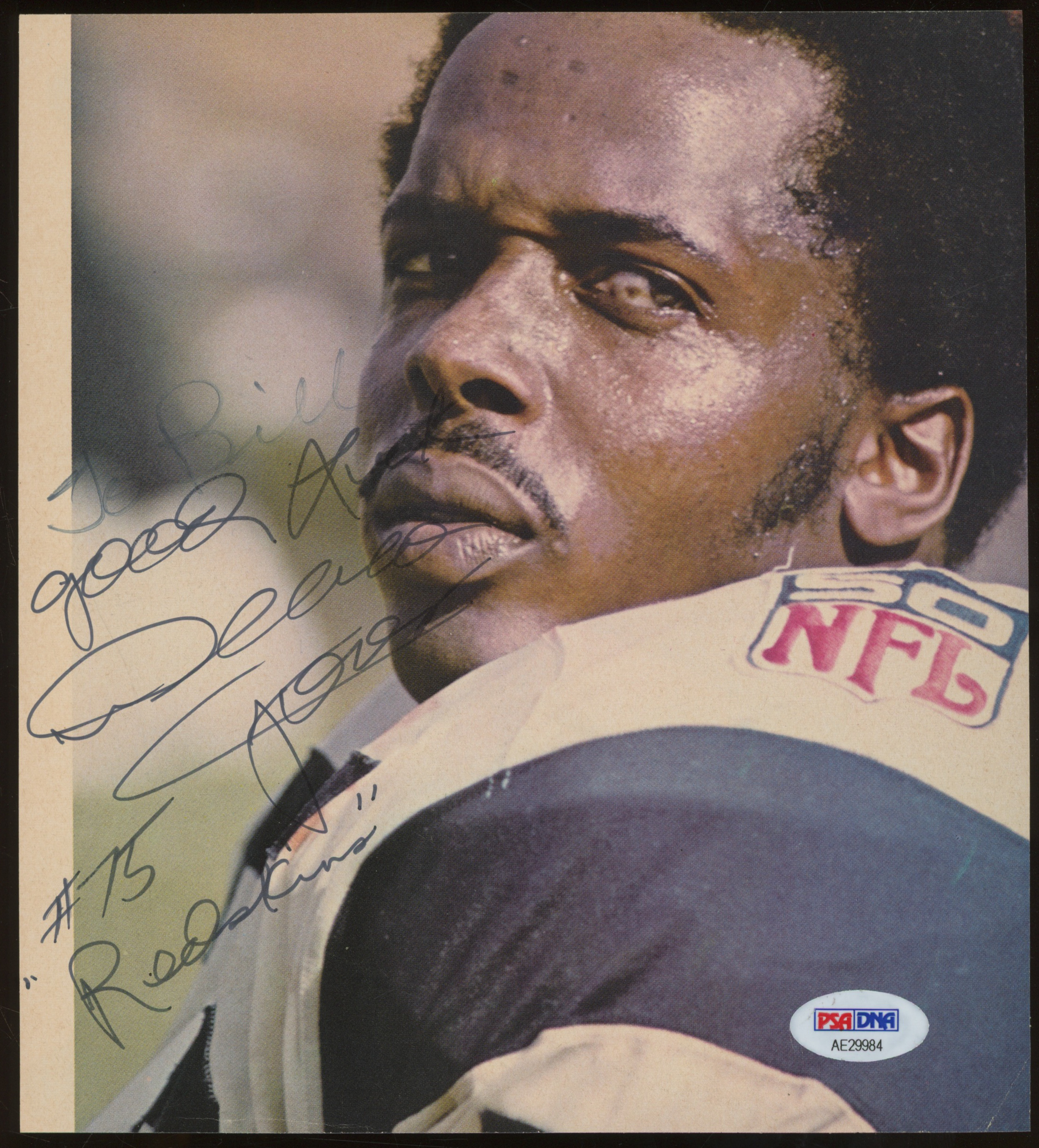 Magazine page measures 7" x 8" in size and has been hand-signed and inscribed in blue felt-tip pen by Deacon Jones (D. 2013, HOF). Please note, autograph has been personalized to "Bill".