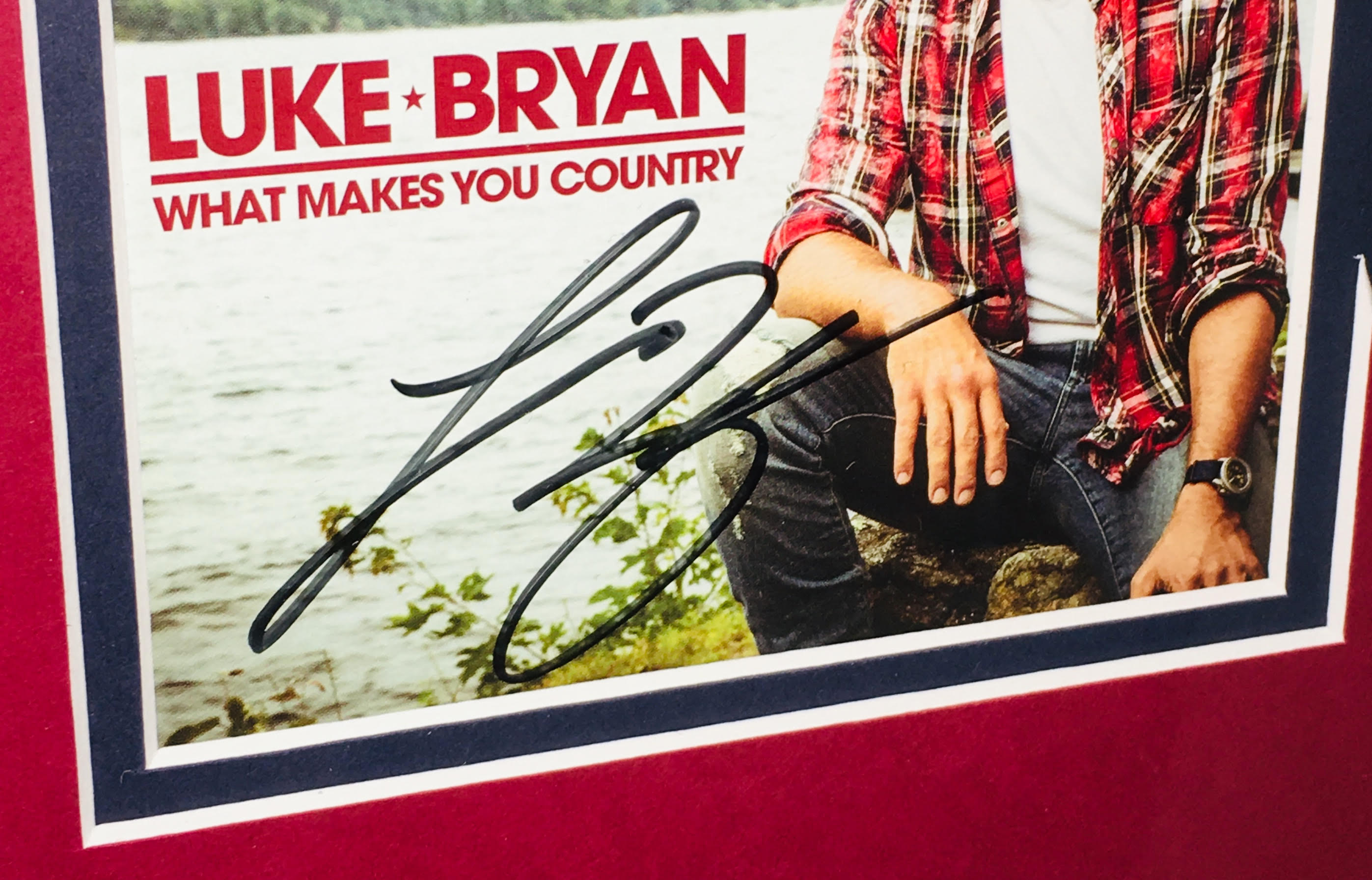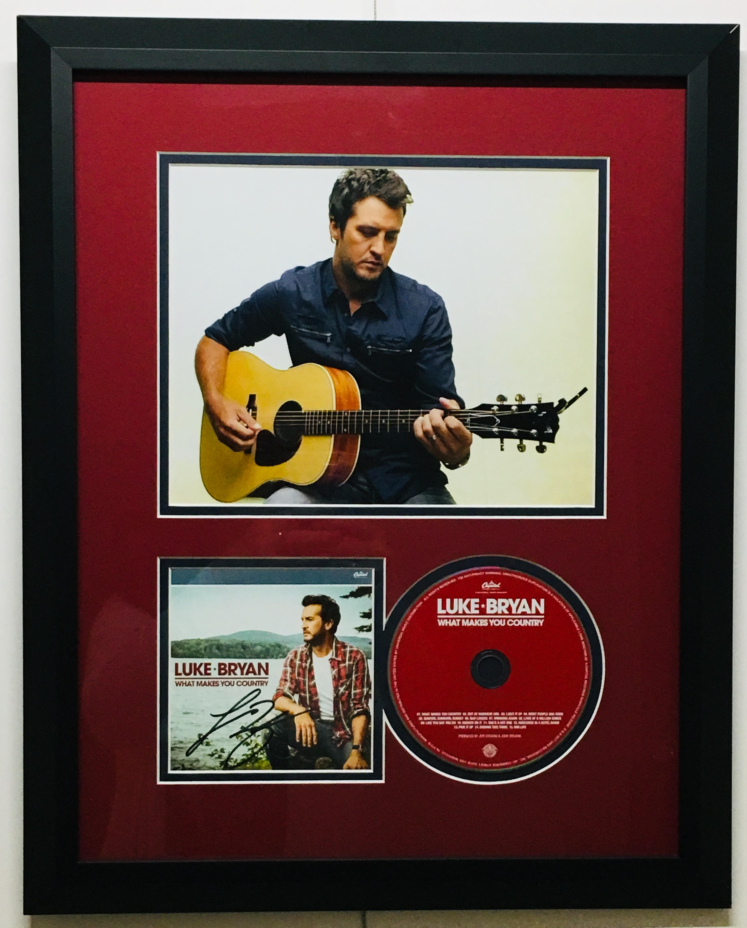 Custom frame display measures approximately 16" x 20" in size and features a CD album that has been hand-signed in black felt-tip pen by Luke Bryan.