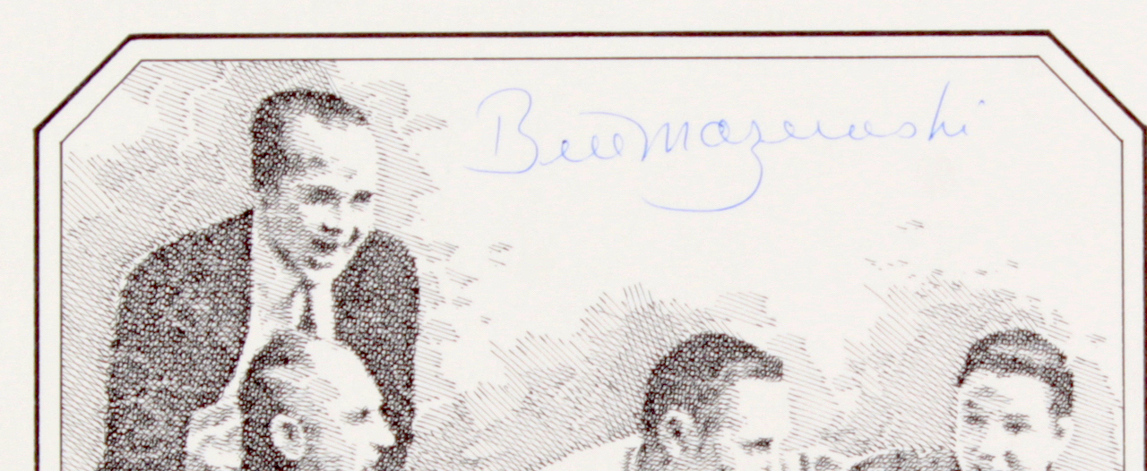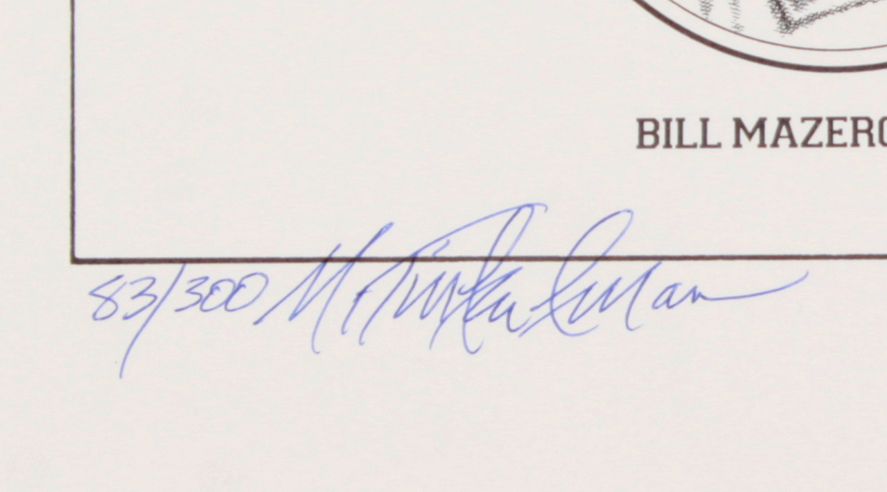 Lithograph measures 16" x 20" in size and has been hand-signed in blue ink pen by Bill Mazeroski (Pirates, HOF) and Ralph Terry (Yankees). This item is a limited edition and has been hand-numbered out of 300. Also, the lithograph has been hand-signed by the original artist.