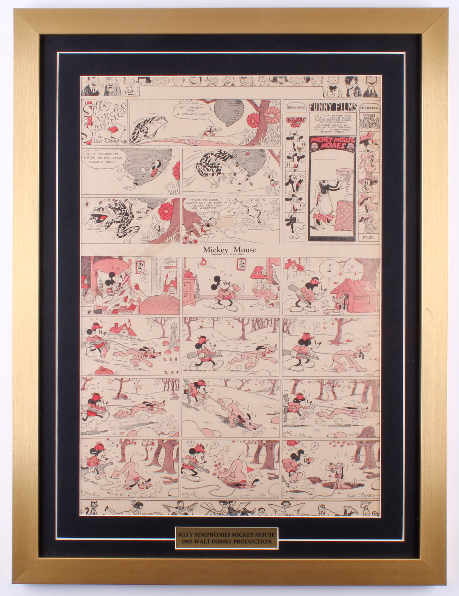 Custom framed 1933 "Silly Symphonies" Original Disney Comic Strip measures approximately 20" x 27" in size.