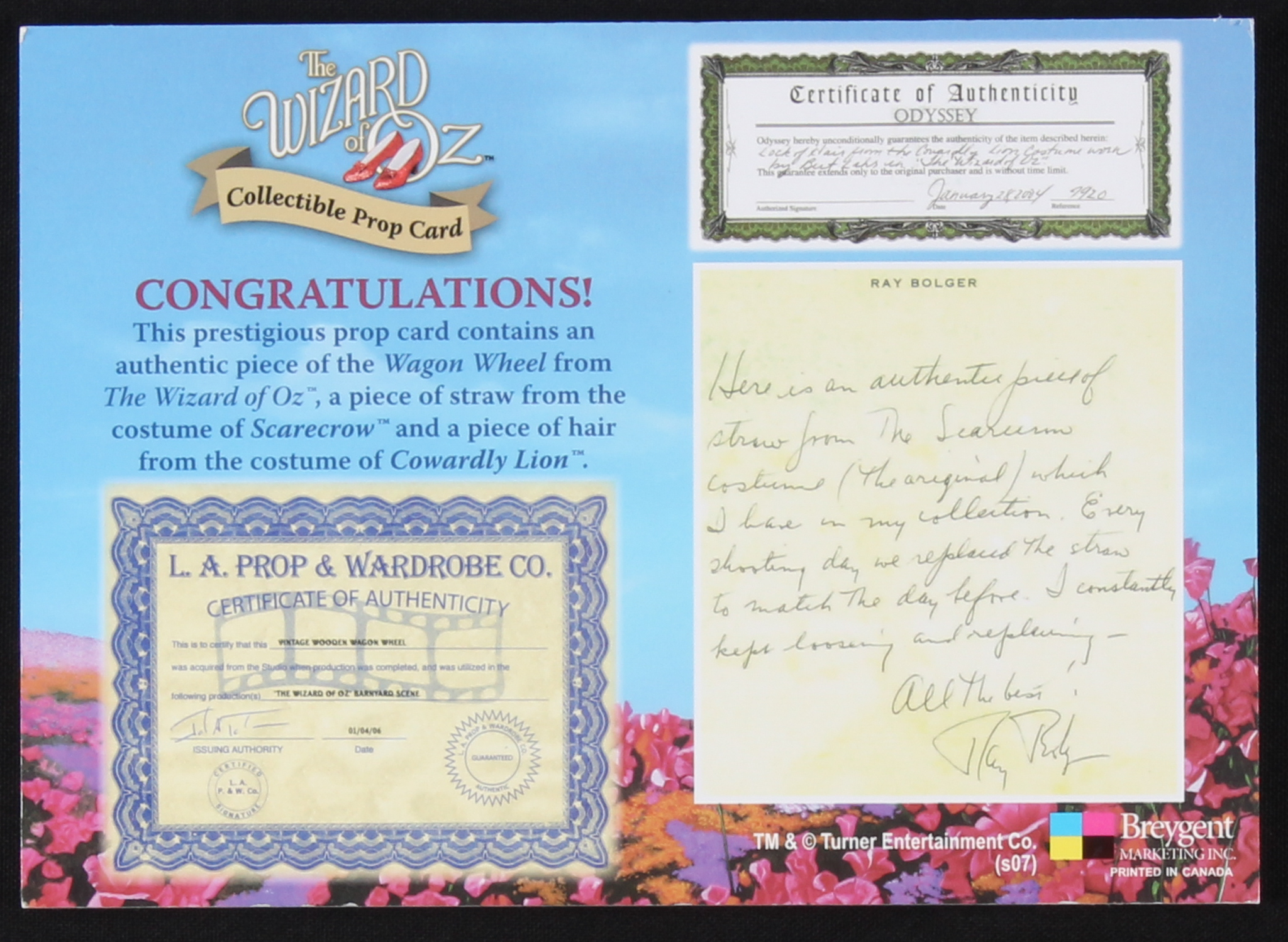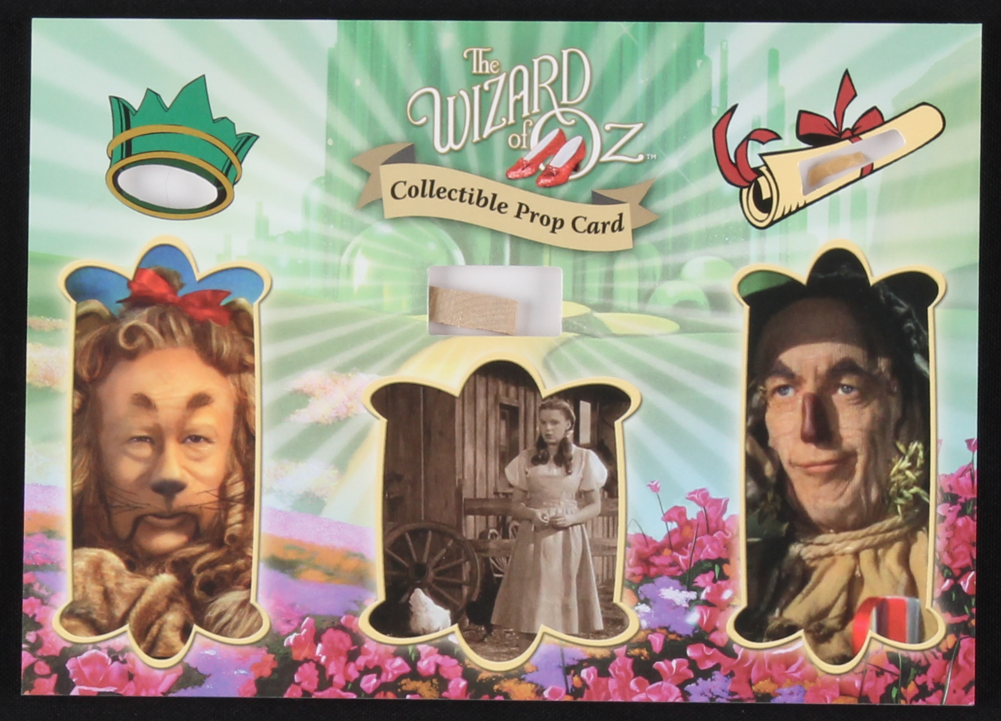 "Wizard of Oz" Prop Card Display With Piece of Wagon Wheel, Straw From Scarecrow & Hair From Lion (Odyssey COA)