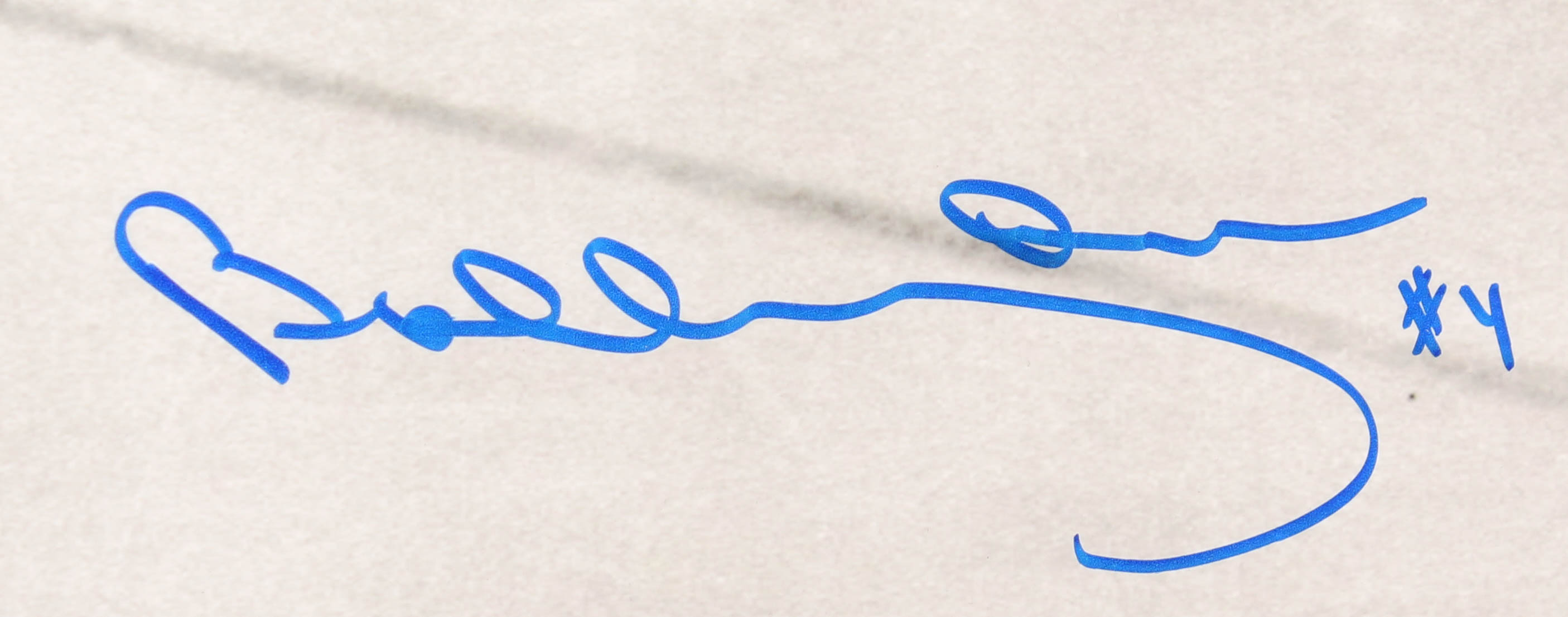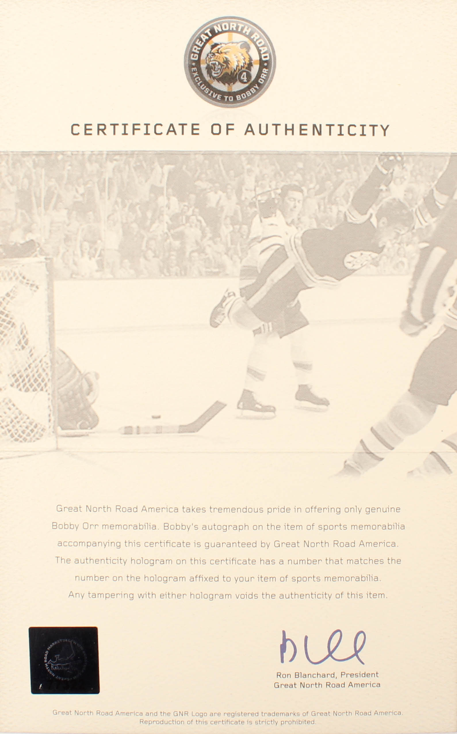 Custom framed display measures approximately 27.5" x 31.75" in size and features a photo that has been hand-signed in blue felt-tip pen by Bobby Orr (HOF).
