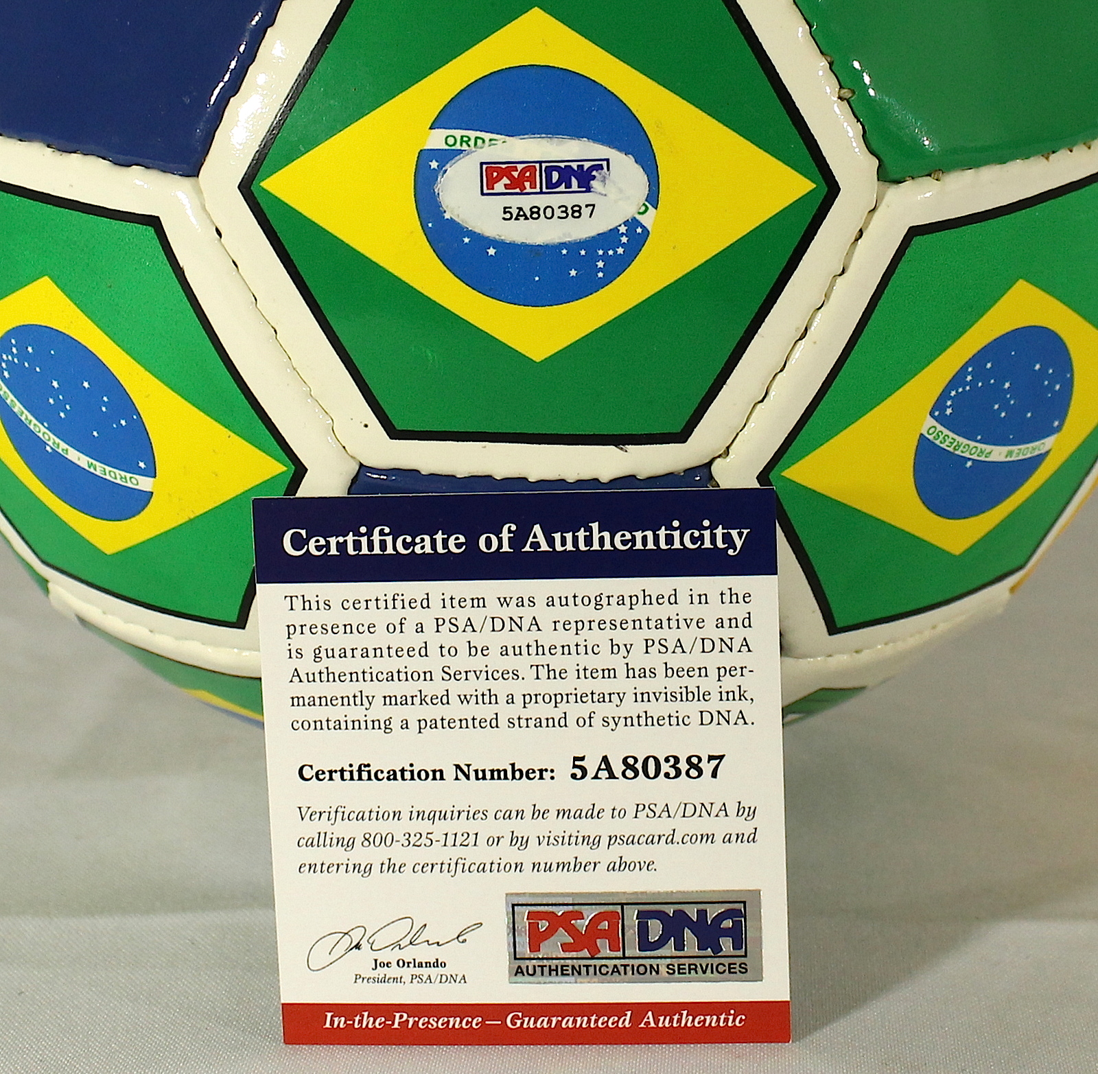 Soccer ball has been hand-signed in black felt-tip pen by Pele. The autograph includes an official PSA/DNA hologram and matching COA for authenticity purposes.