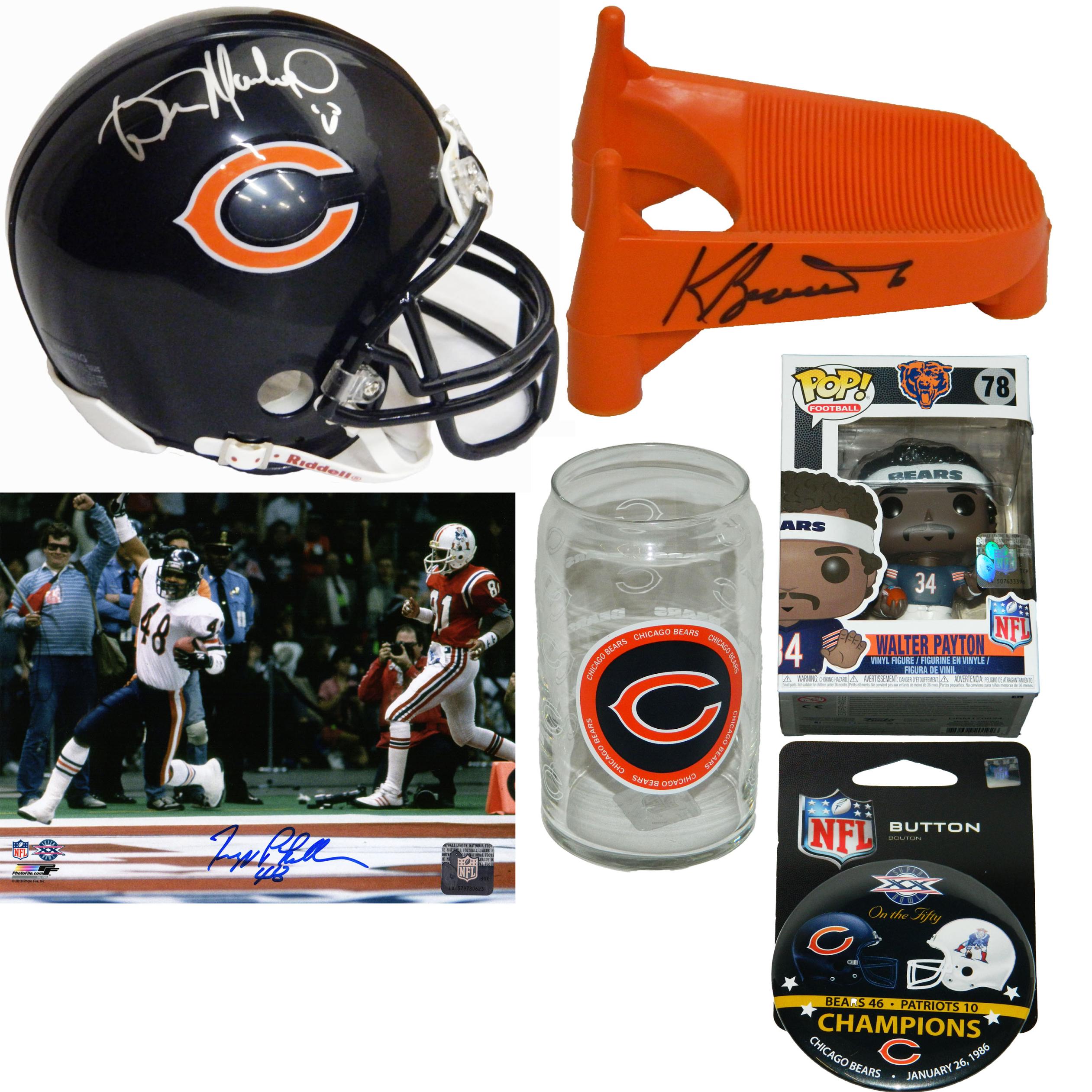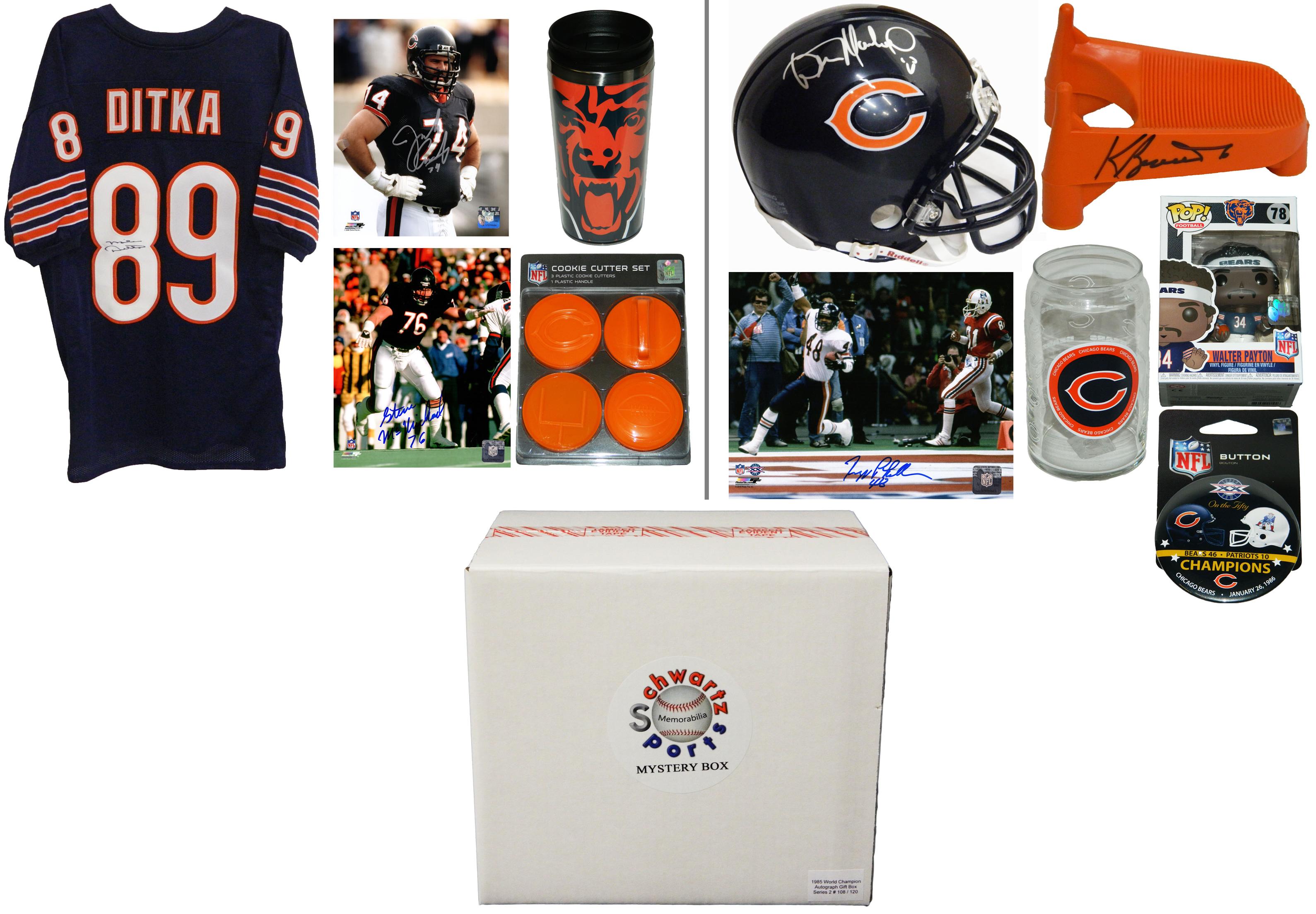 Each 1985 Bears World Champs Gift box contains two (3) autographed items and at least two (2) Chicago Bears souvenirs/collectibles. Autographed items in this edition include mini helmets, custom football jerseys, 8x10 photos, full size footballs and more. There are over 30 different 1985 Bears players & coaches included in this Series 2.
