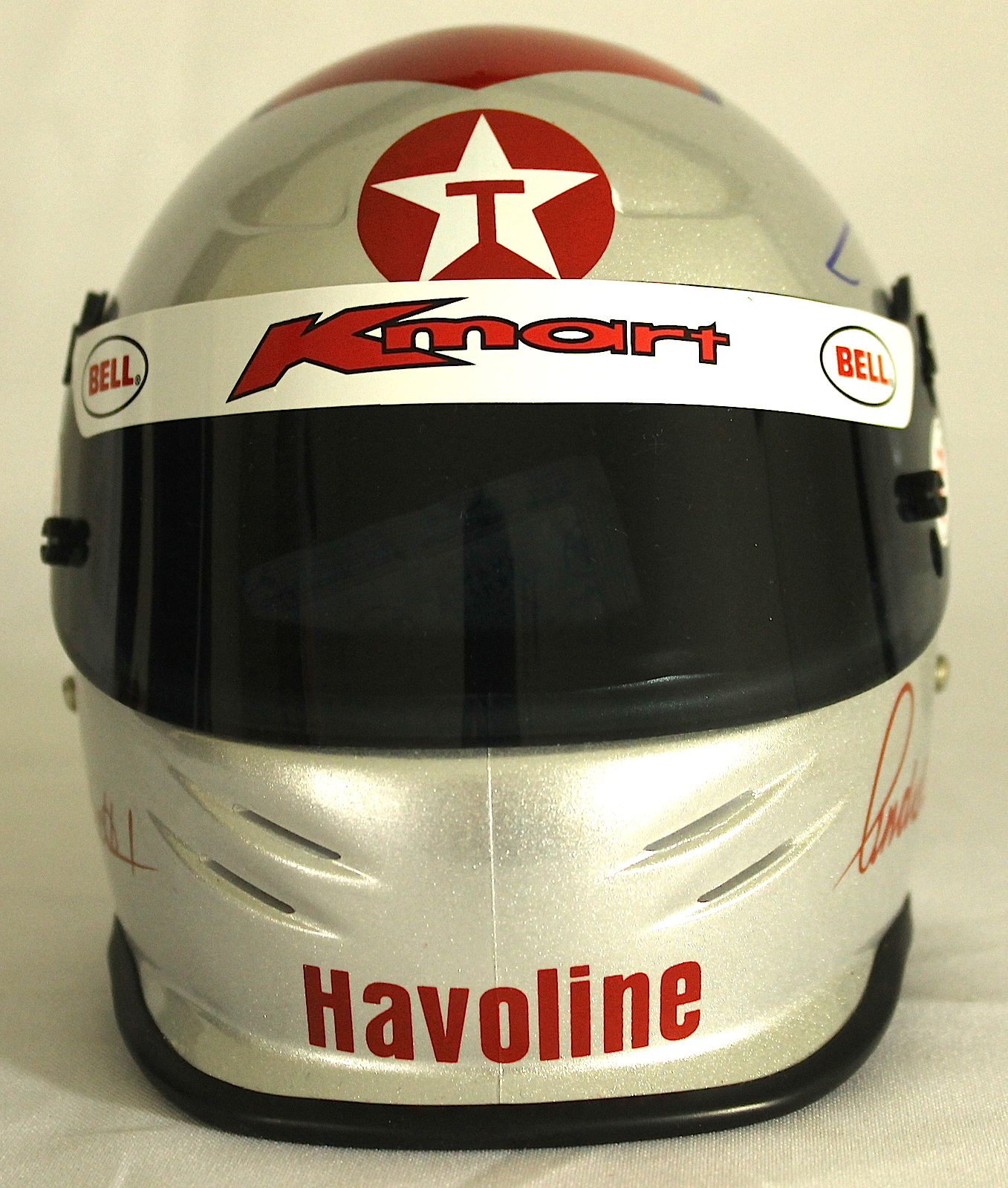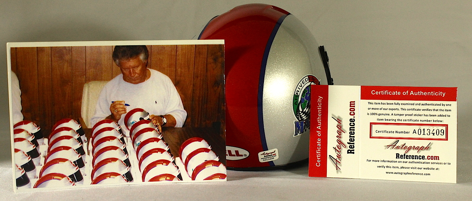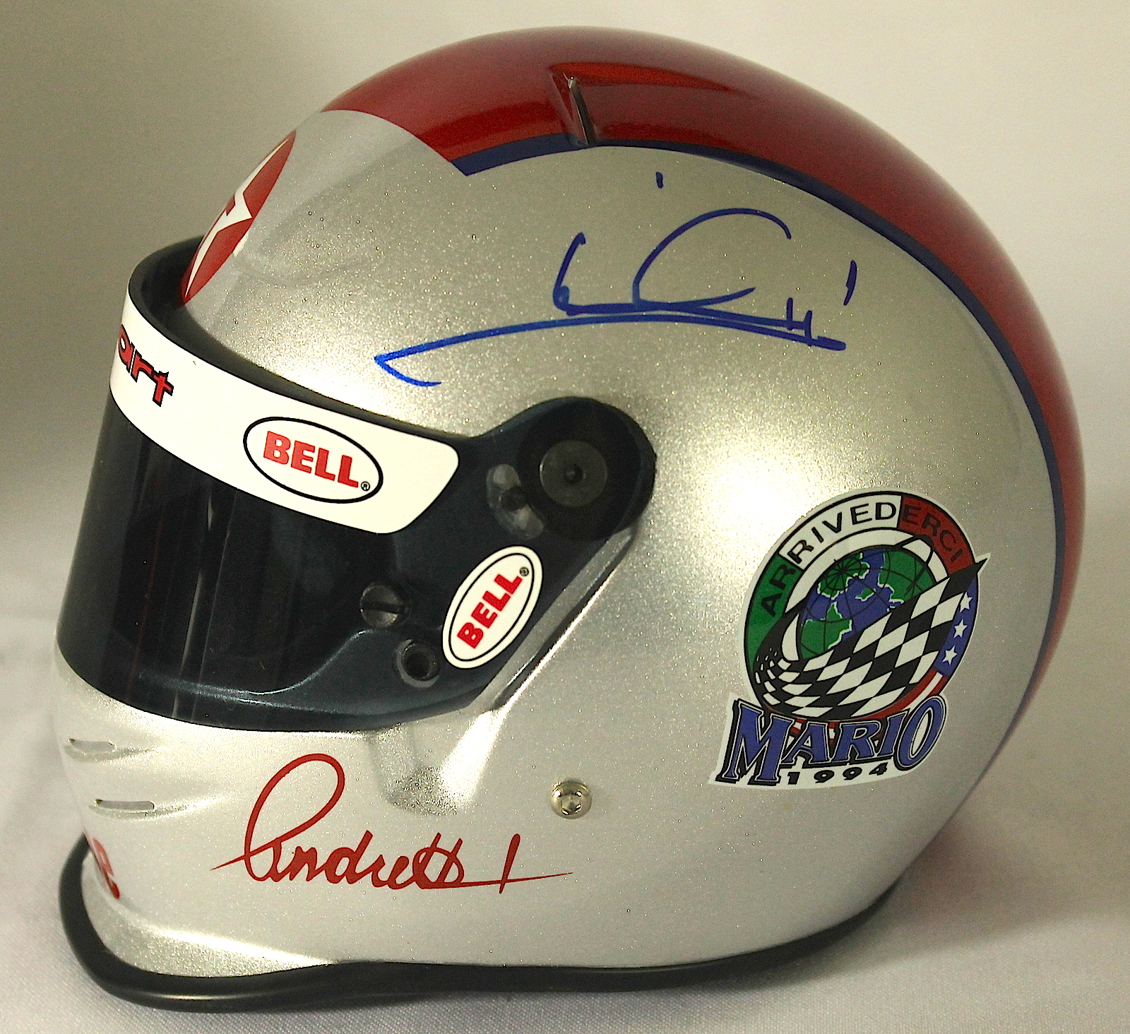 Bell mini-helmet hand-signed in blue felt-tip pen by Mario Andretti. The autograph includes an official Autograph Reference hologram and matching COA for authenticity purposes.
