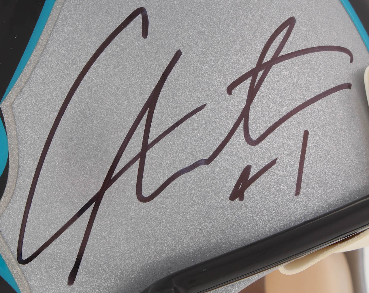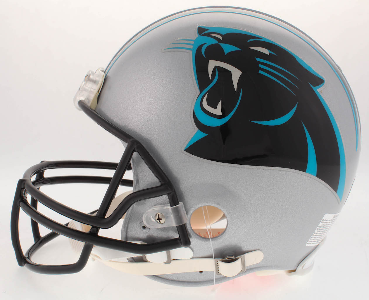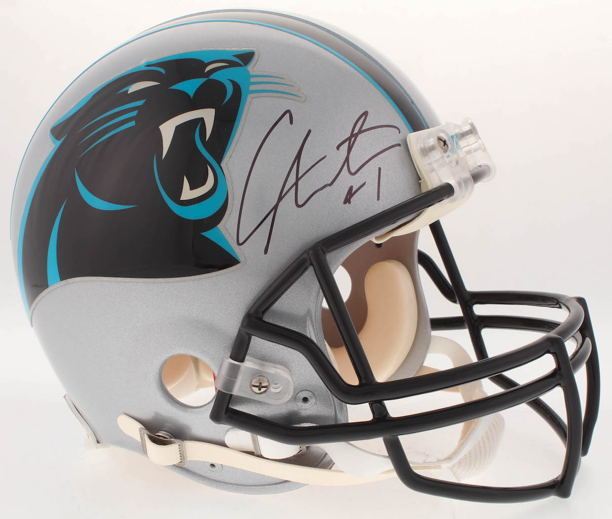 Riddell Carolina Panthers full-size authentic on-field helmet. Hand-signed in black paint pen by Cam Newton.
