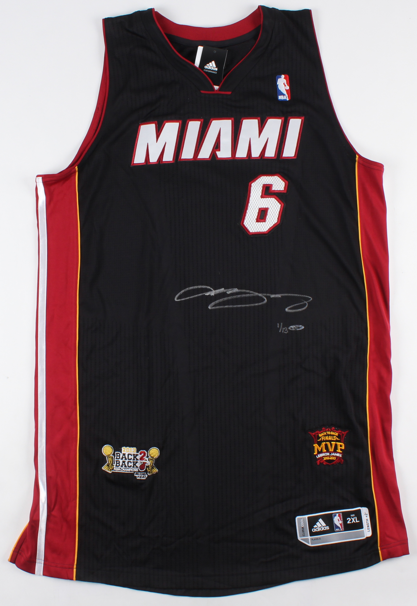 Adidas ClimaCool on-court style jersey. Everything is sewn on, size 2XL. Hand-signed in silver paint pen by LeBron James (Lakers). The jersey is limited edition and has been hand-numbered #1/13. "Back 2 Back" and "2013 NBA Finals MVP" Patches have been custom stitched onto the front of the jersey.