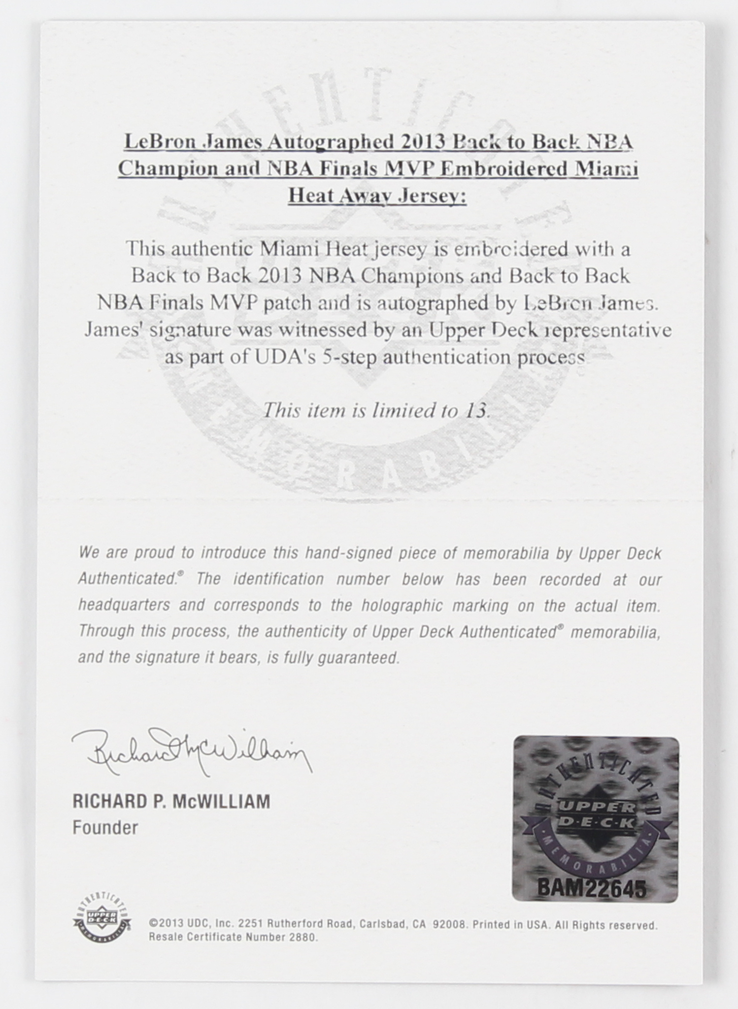 The lot / autograph(s) includes an official Upper Deck Authenticated (UDA) hologram and matching COA for authenticity purposes.
