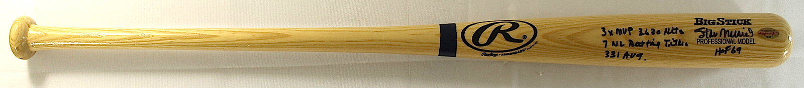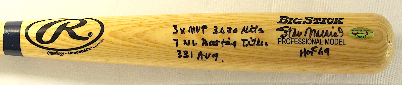 Rawlings Big Stick Stat Bat with (6) career stat inscriptions. Hand-signed and inscribed in black felt-tip pen by Stan Musial (Cardinals HOF, D 2013). The autograph includes an official PSA/DNA Hologram & an official Reggie Jackson hologram for authenticity purposes.