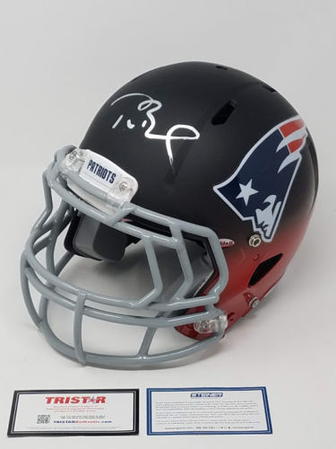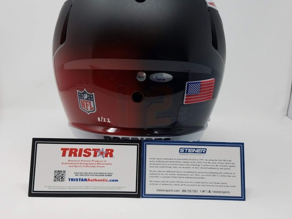 This New England Patriots Custom "Fade to Black Edition" authentic helmet has been personally hand-signed by quarterback Tom Brady. It is officially licensed by the National Football League and comes with an individually numbered, tamper evident hologram from TriStar and Steiner Sports Authenticated. To ensure authenticity, the hologram can be reviewed online. This process helps to ensure that the product purchased is authentic and eliminates any possibility of duplication or fraud. This helmet is limited to only 12 and you will receive a random number from the edition. These are in stock and ready to ship. This piece comes complete with the serial numbered hologram from Steiner Sports and TriStar Authenticated. Includes certificate of authenticity and hologram! Brady's signature is guaranteed authentic through the Steiner Sports hologram system.