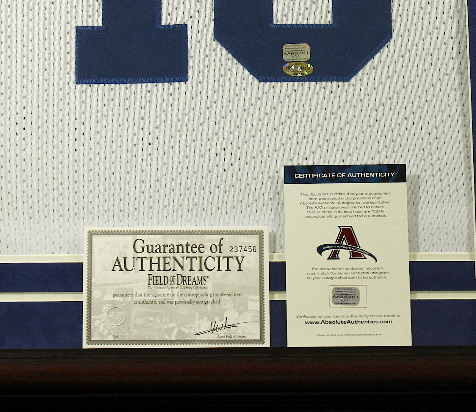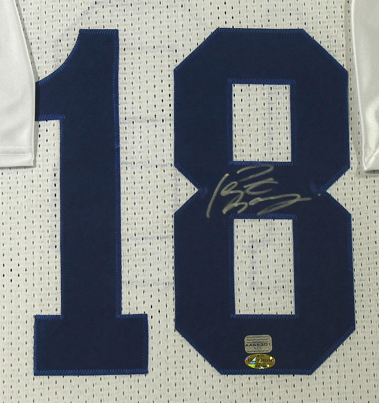 Custom framed display measures 36" x 43" in size and features an on-field style Colts jersey which has been hand-signed in silver paint pen by Peyton Manning (Colts, Broncos). The autograph includes an official Absolute Authentics (AAA) hologram and matching COA for authenticity purposes.