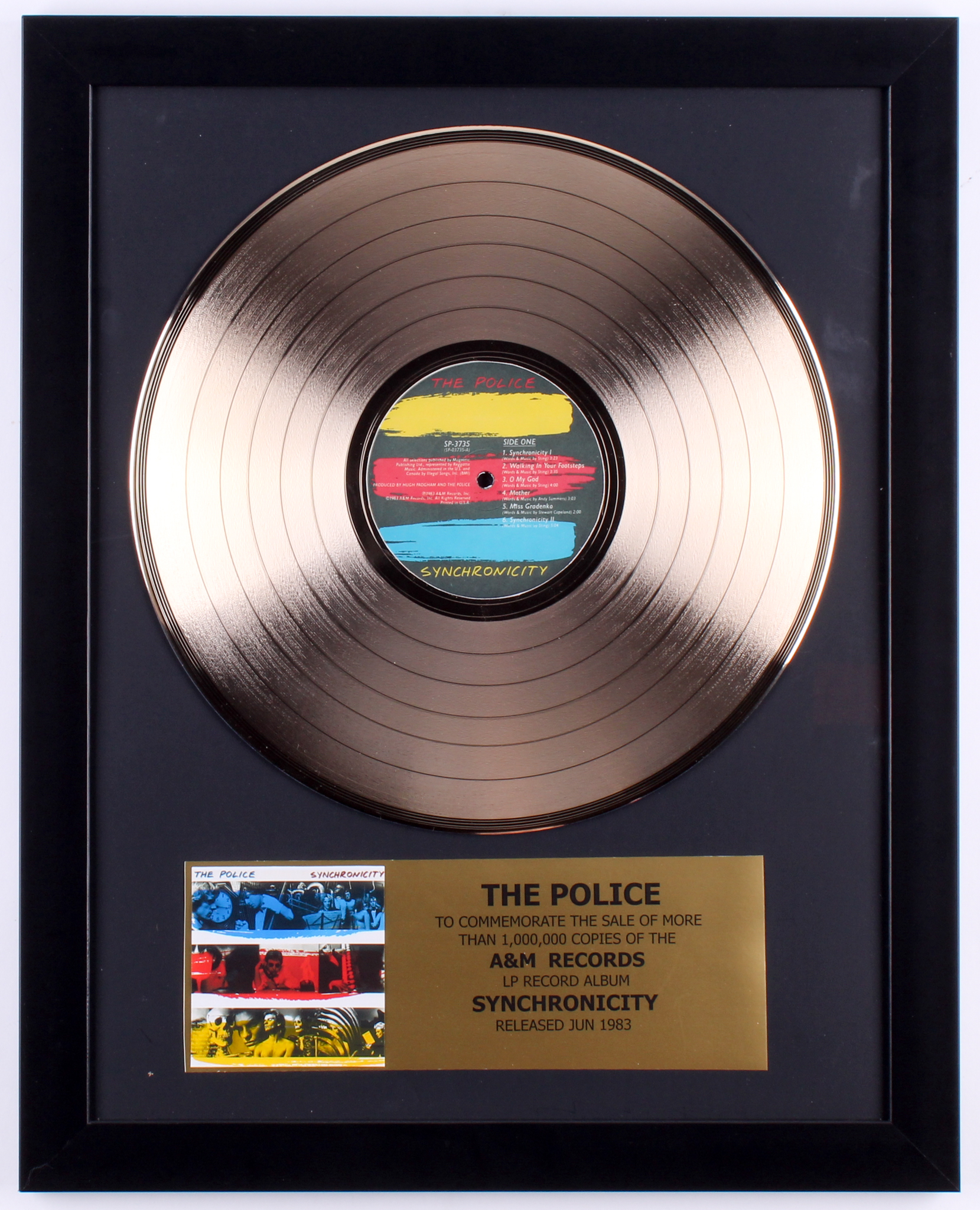 This custom framed award measures approximately 16" x 20" in size. The plaque identifies it as an award presented "to commemorate the sale of more than 1,000,000 copies of the A&M Records LP Record Album "Synchronicity" released June 1983.