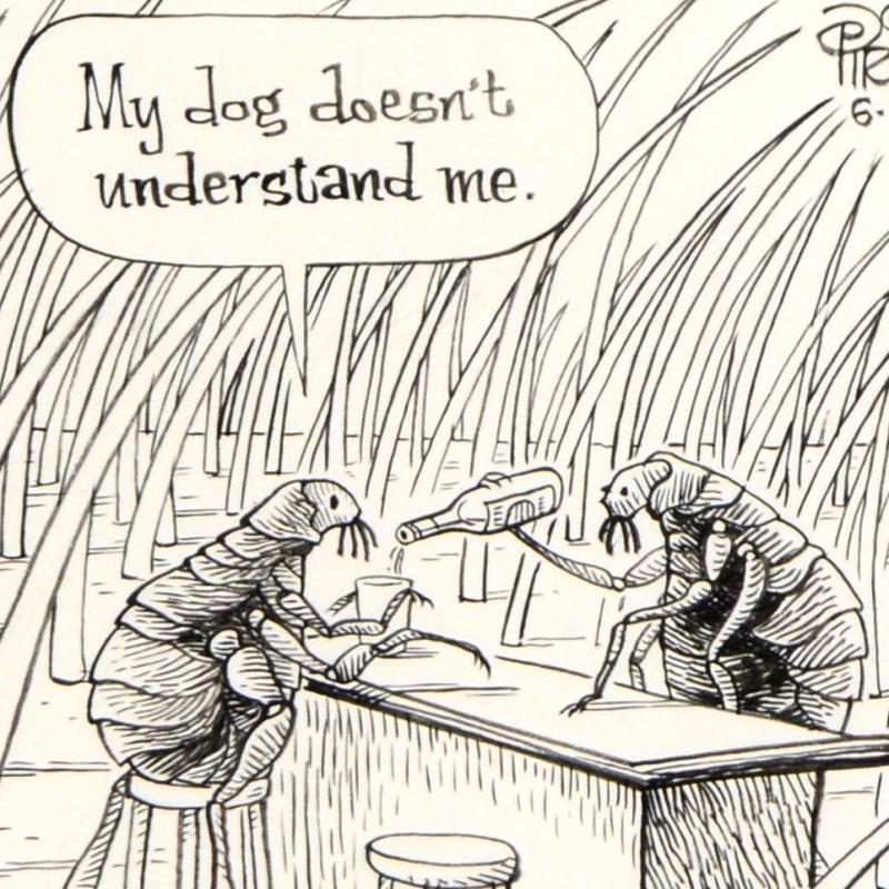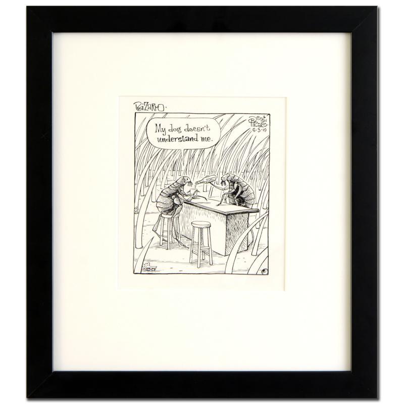Enter a surreal and satirical world of twisted imagination and award winning creativity. "Flea Bar" is an original pen & ink drawing on paper by Dan Piraro, creator of the critically acclaimed and award winning comic strip, Bizarro! This piece is hand signed and comes framed. Includes Certificate of Authenticity! Measures approx. 13" x 14" (with frame), 6" x 7" (image). ** Please note: there is minor wear to the corners of the frame. **