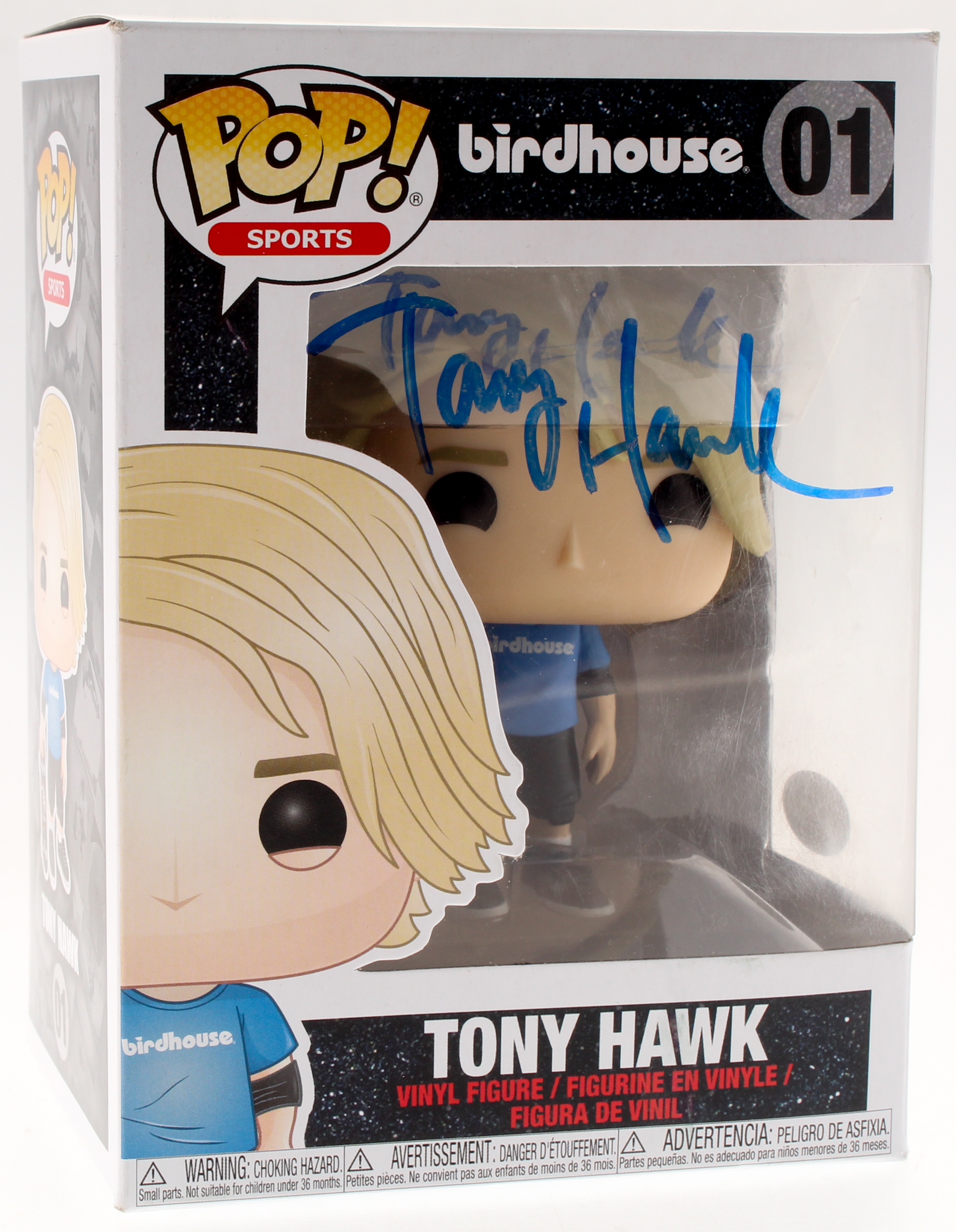 Funko Pop! Vinyl figure measures approximately 4" tall and comes in the original packaging as shown. Hand-signed in blue paint pen by Tony Hawk.