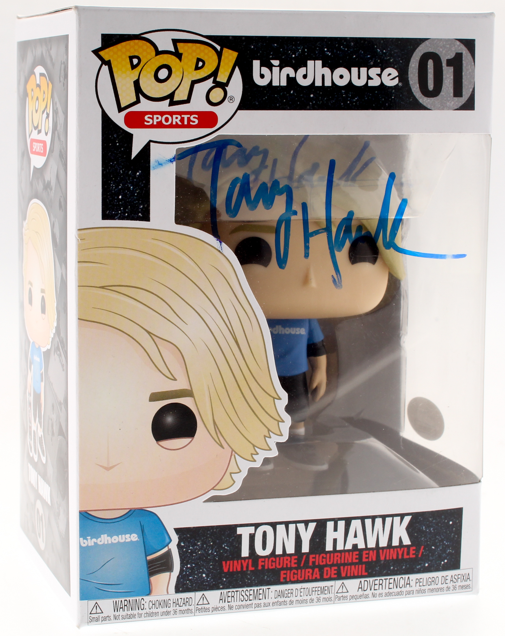 Funko Pop! Vinyl figure measures approximately 4" tall and comes in the original packaging as shown. Hand-signed in blue paint pen by Tony Hawk.