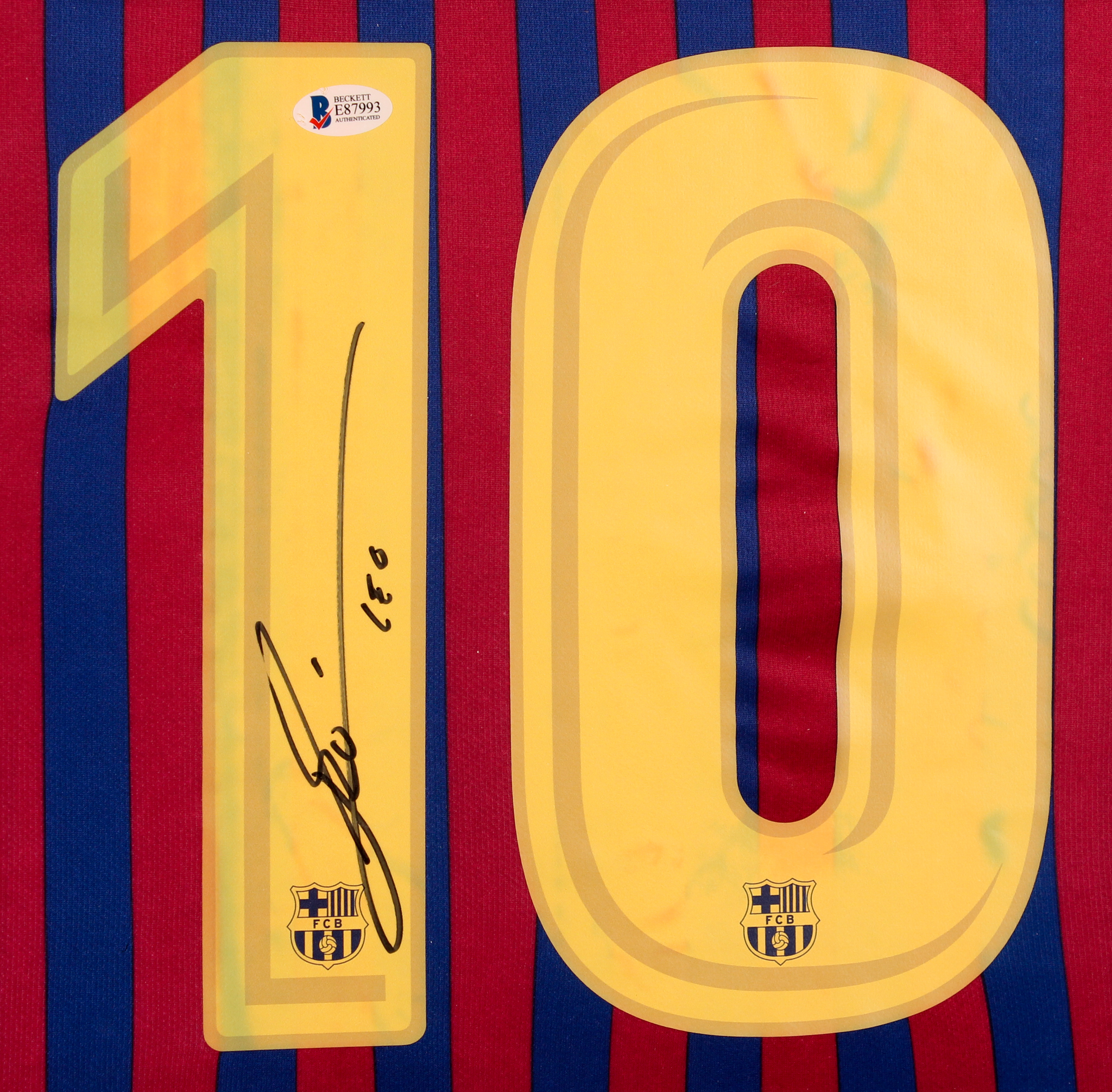 Custom frame measures approximately 35" x 43" in size and features a jersey which has been hand-signed in black felt-tip by Lionel Messi.
