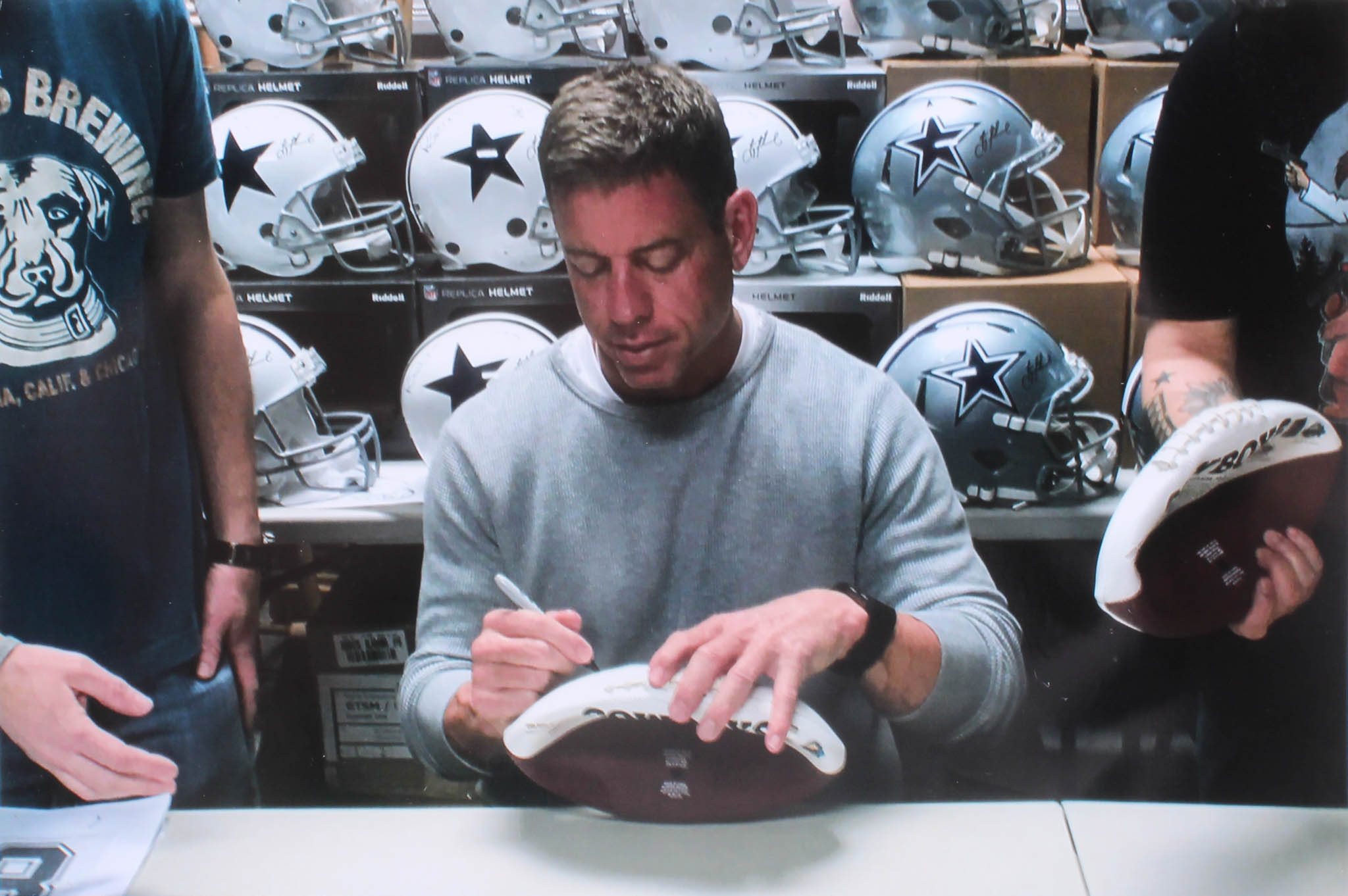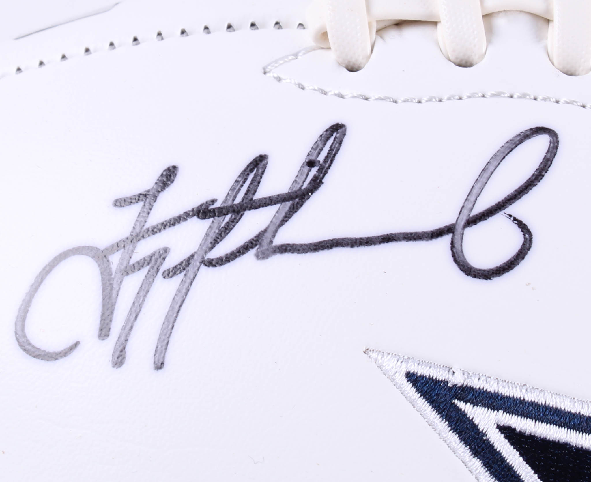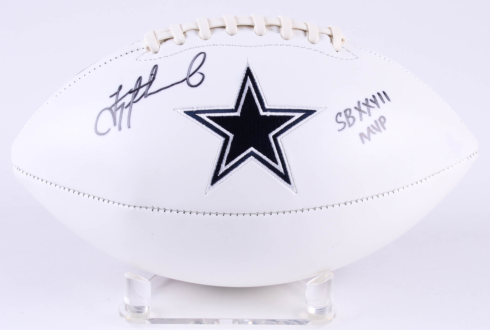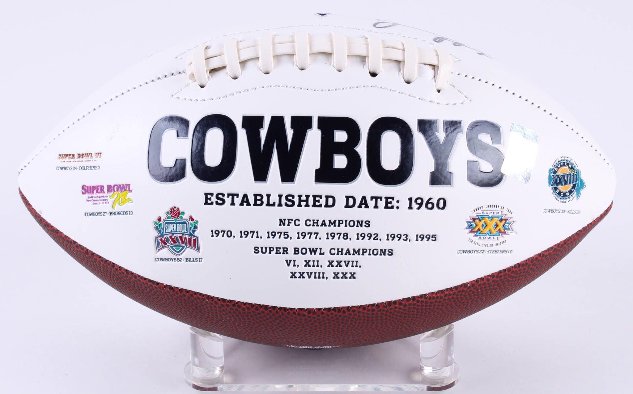 Full-size Dallas Cowboys logo football. Hand-signed and inscribed in black felt-tip pen by Troy Aikman (HOF).