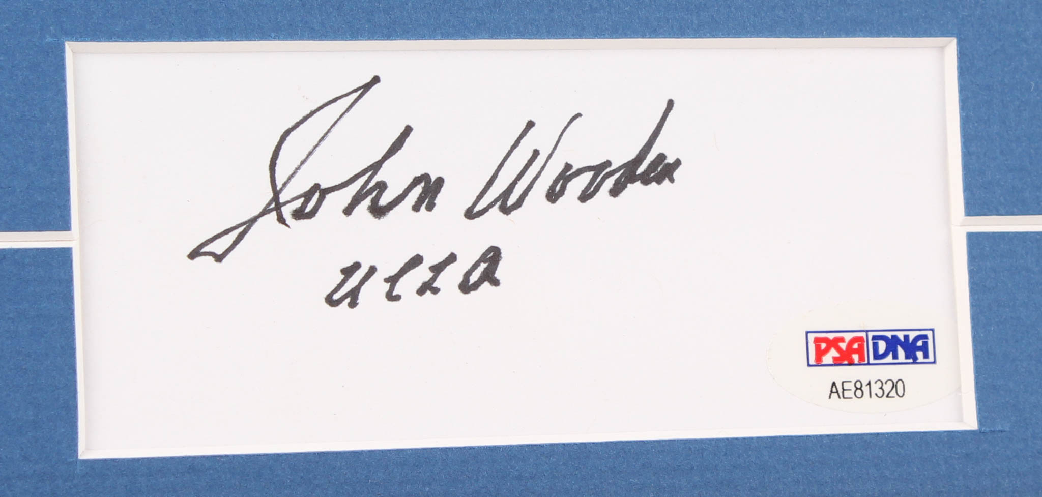 Custom framed display measures 15" x 16" in size and features a cut that has been hand-signed and inscribed in black felt-tip pen by John Wooden (D. 2010, HOF). Display also includes a "Pyramid of Success" photo and vintage 1960's UCLA pin.