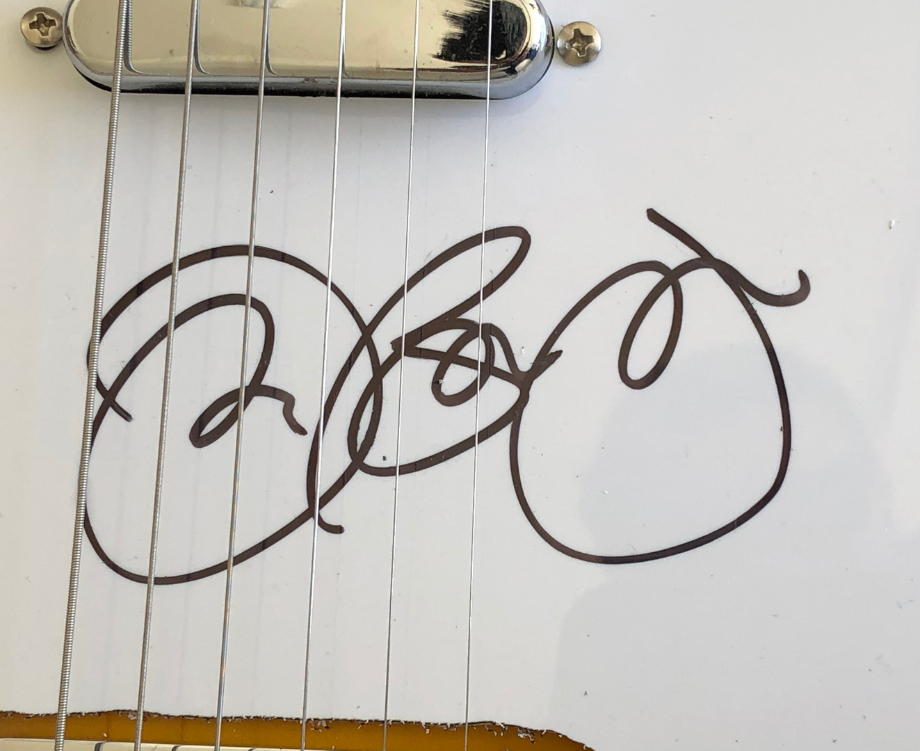 Full-size Huntington electric guitar has been hand-signed in black felt-tip pen by Jon Bon Jovi.
