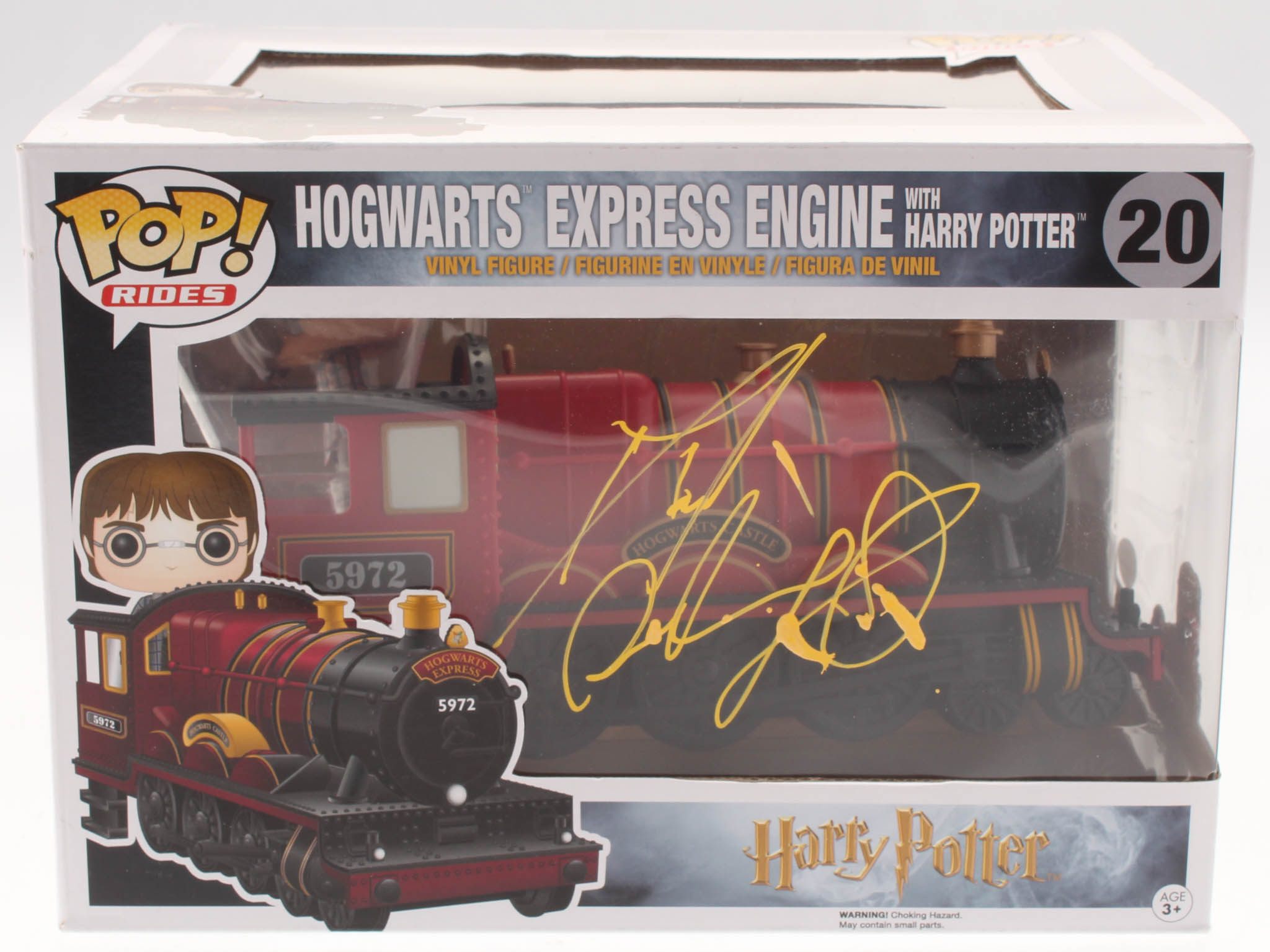 Funko Pop! Hogwarts Express Engine Vinyl figure measures approximately 8.5" long and comes in the original packaging as shown. Hand-signed in yellow paint pen by Daniel Radcliffe.