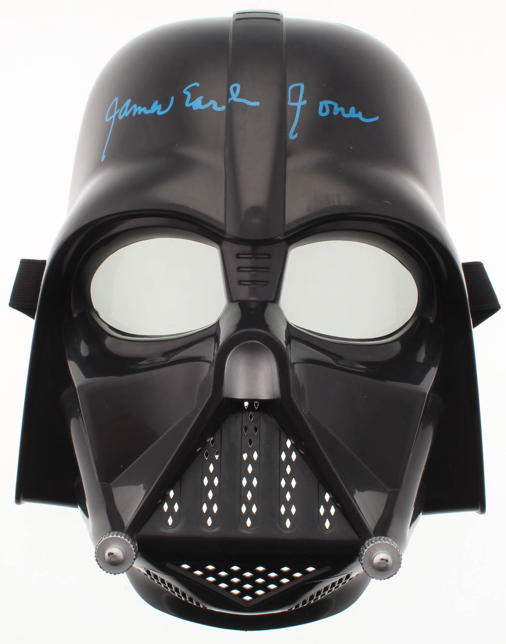 Replica Darth Vader Mask has been hand-signed in blue paint pen by James Earl Jones.