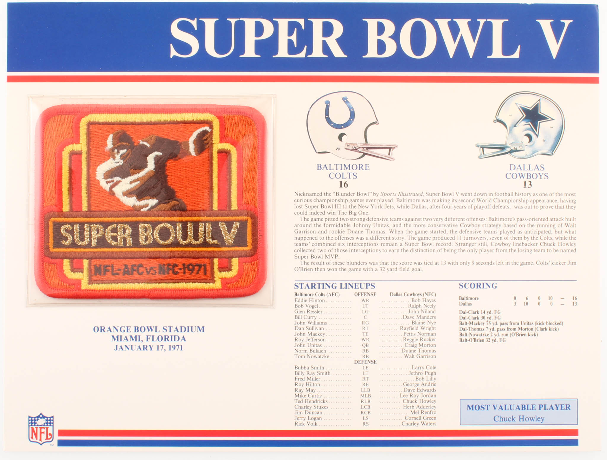 Card measures 9" x 12" in size. Official Super Bowl V Score Card. Also includes a Super Bowl V patch.