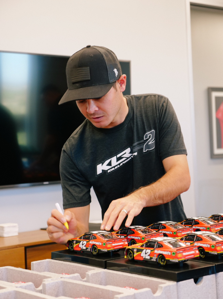 Premium die-cast car hand-signed in silver paint pen by Kyle Larson. The car is limited edition to just 36 produced and includes the original packaging.