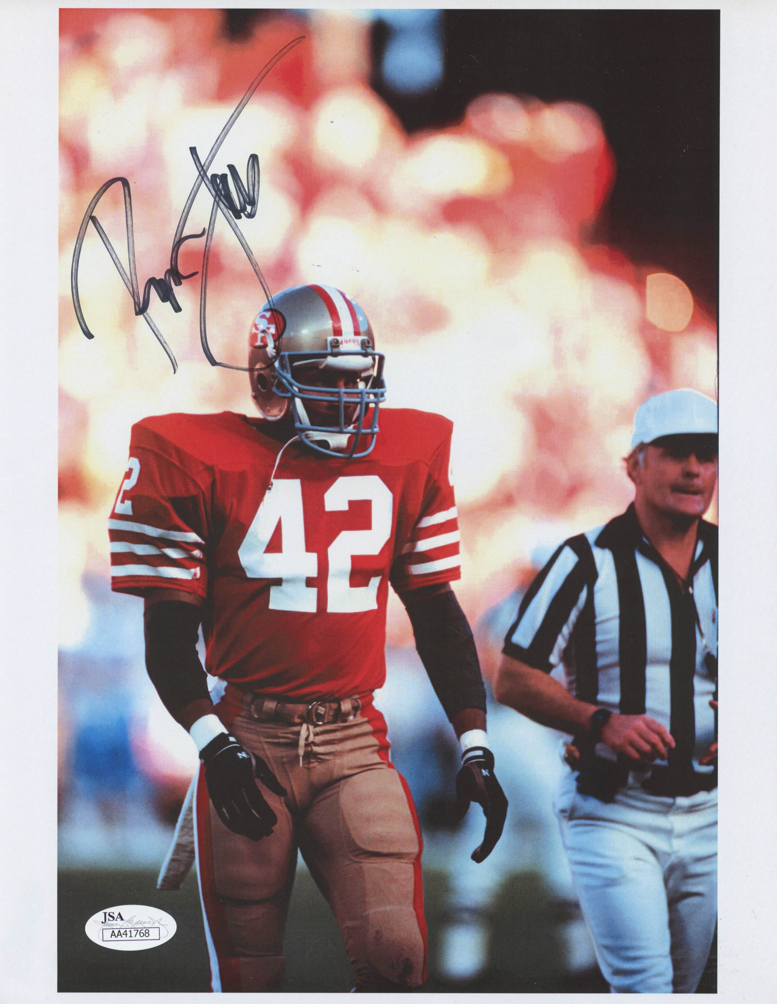 Photo measures 8.5" x 11" in size and has been hand-signed in black felt-tip pen by Ronnie Lott (HOF).