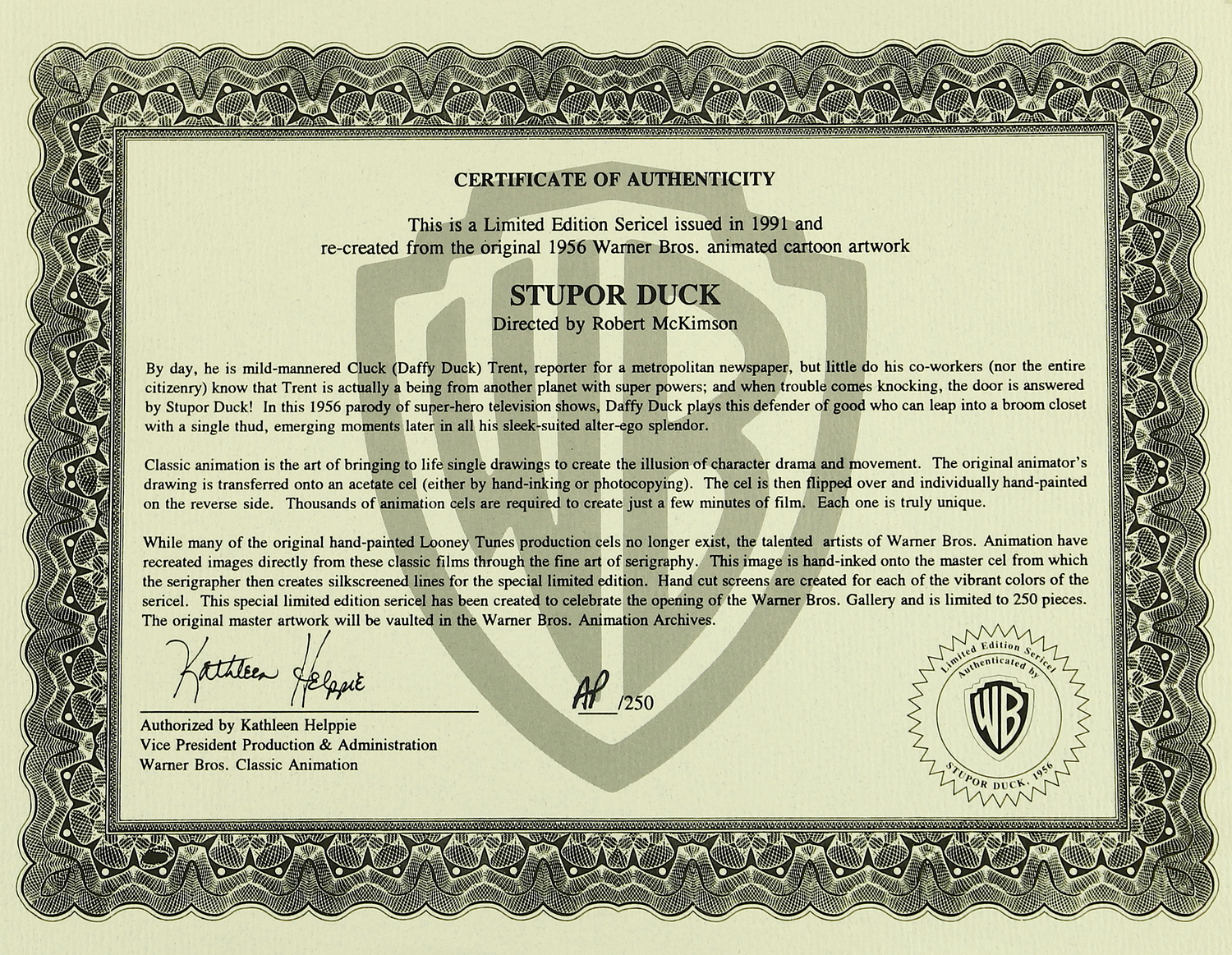 Daffy Duck "Stupor Duck" Warner Bros. Limited Edition Animation Sericel (WB COA)
