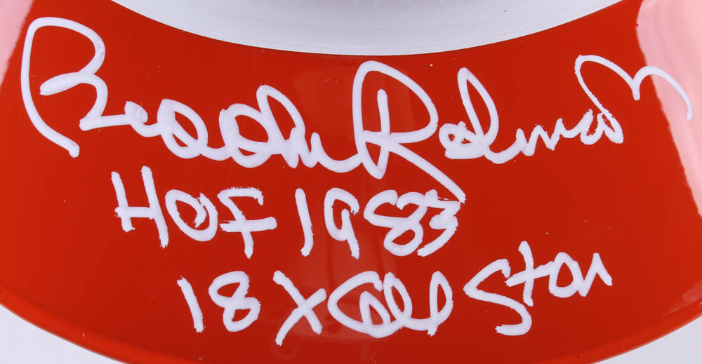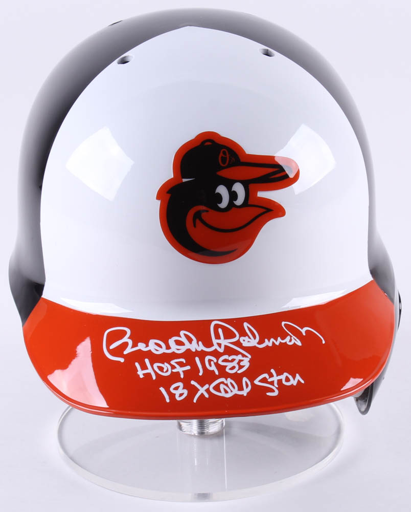 Rawlings Orioles full-size batting helmet with left ear cover. Hand-signed and inscribed in white paint pen by Brooks Robinson (HOF).