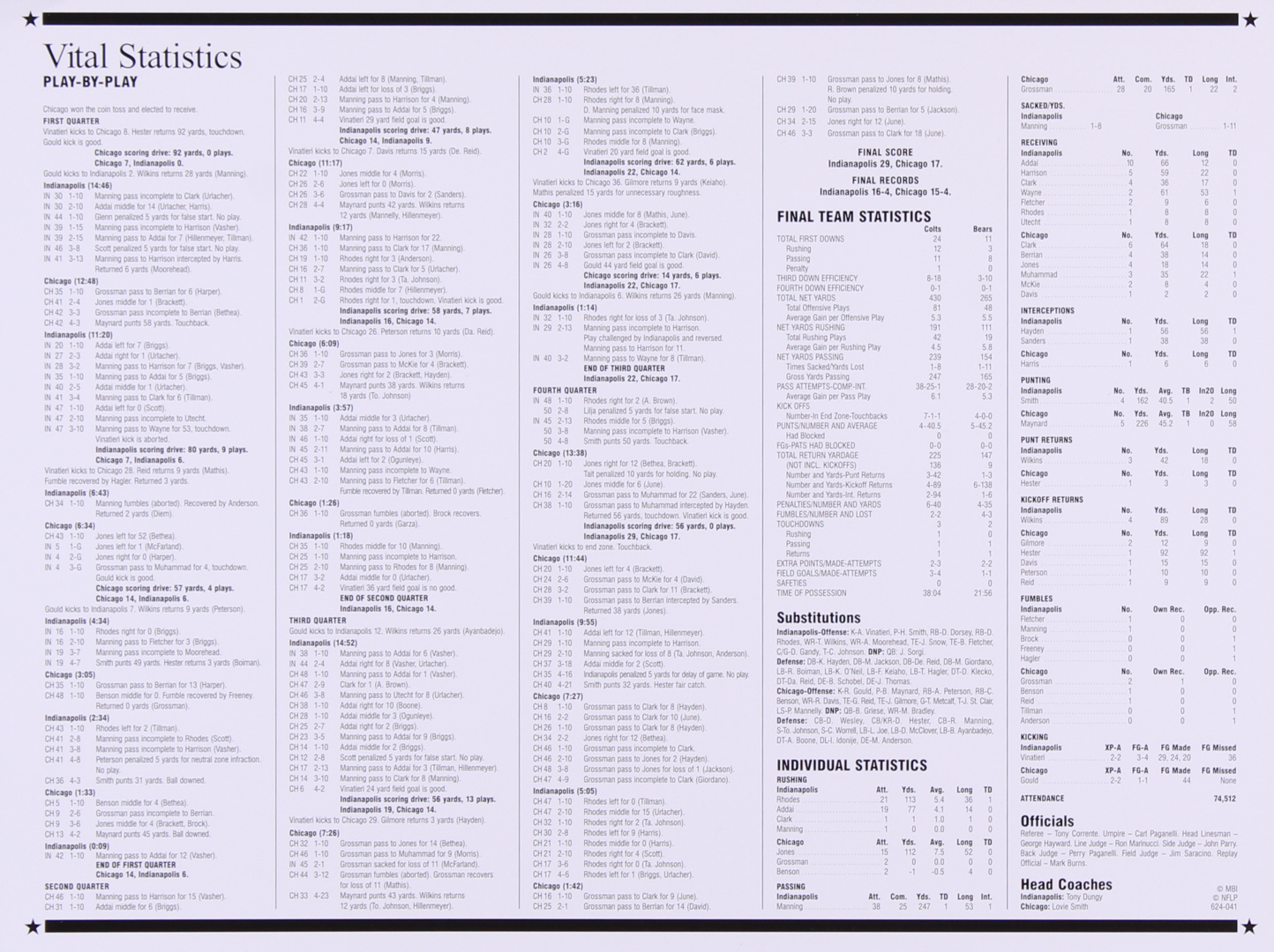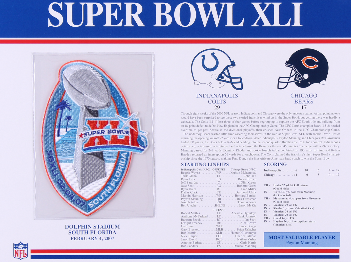 Commemorative Super Bowl XLI Score Card With Patch: Colts vs. Bears