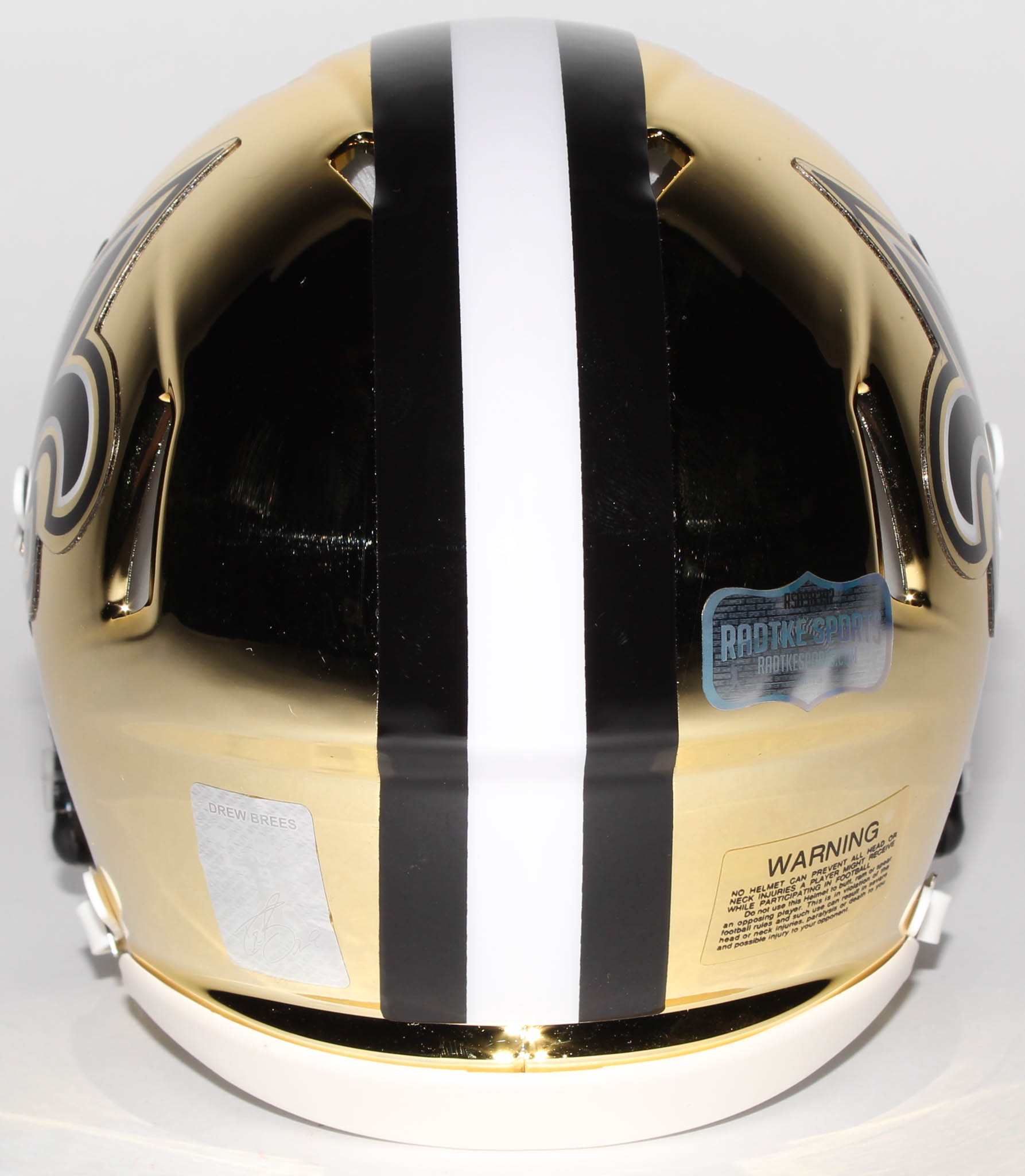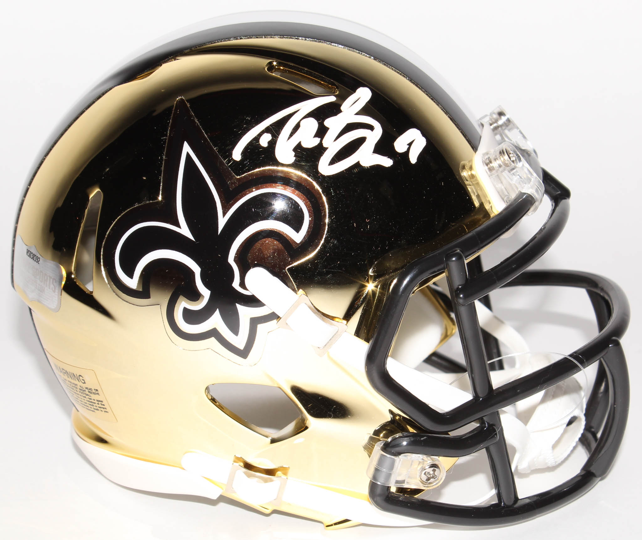 Riddell New Orleans Saints replica chrome speed mini-helmet. Hand-signed in white paint pen by Drew Brees.