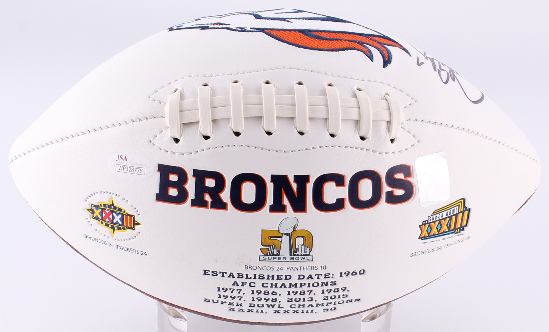 Broncos full-size Logo football. Hand-signed in black felt-tip pen by John Elway (HOF). Please note, football has slight staining.