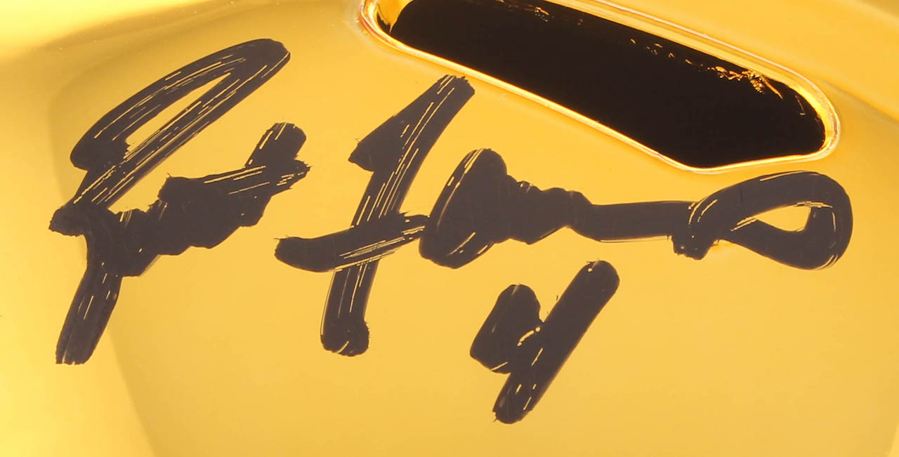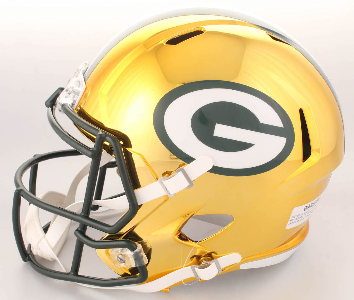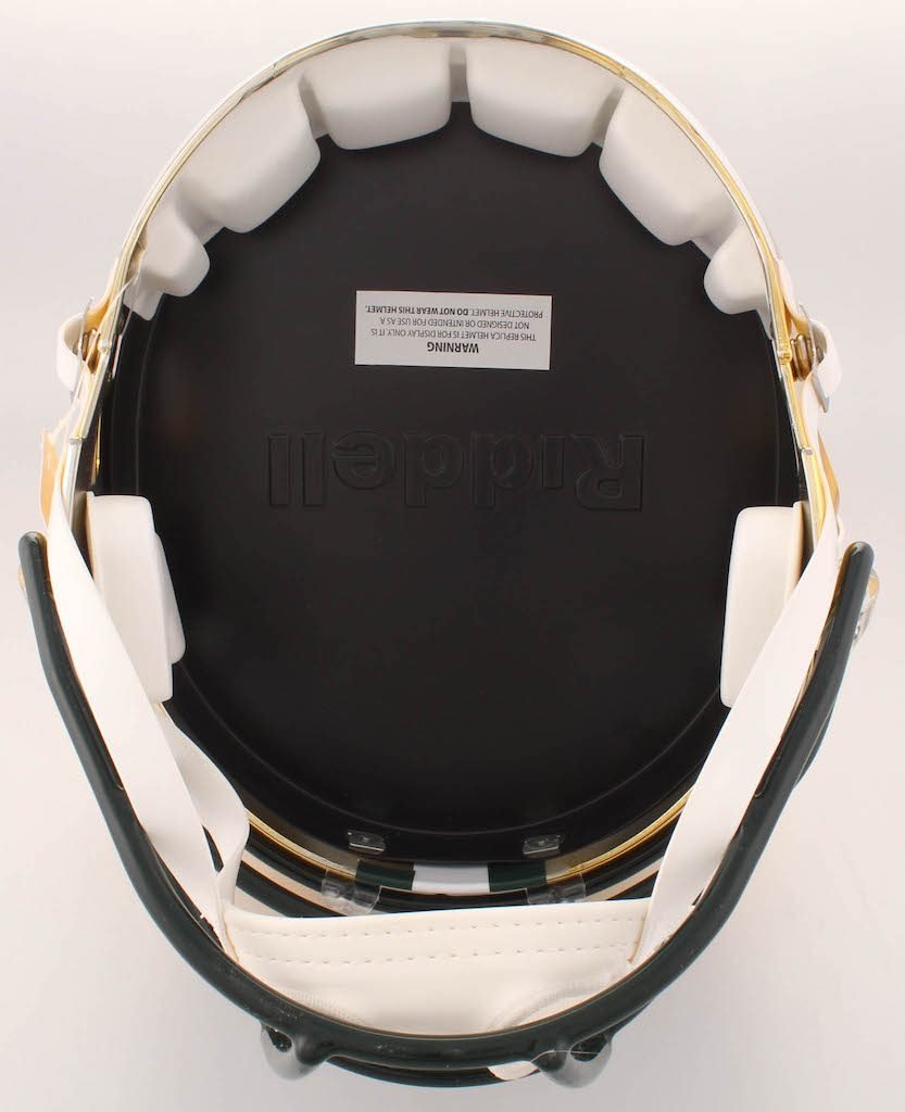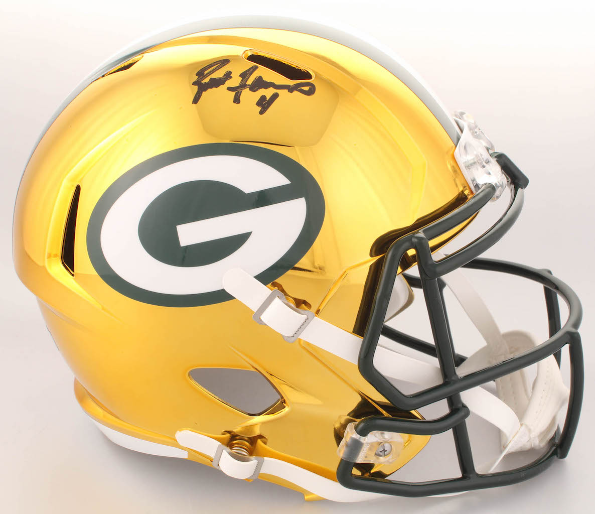 Riddell Green Bay Packers full-size replica chrome speed helmet. Hand-signed in black felt-tip pen by Brett Favre (HOF).