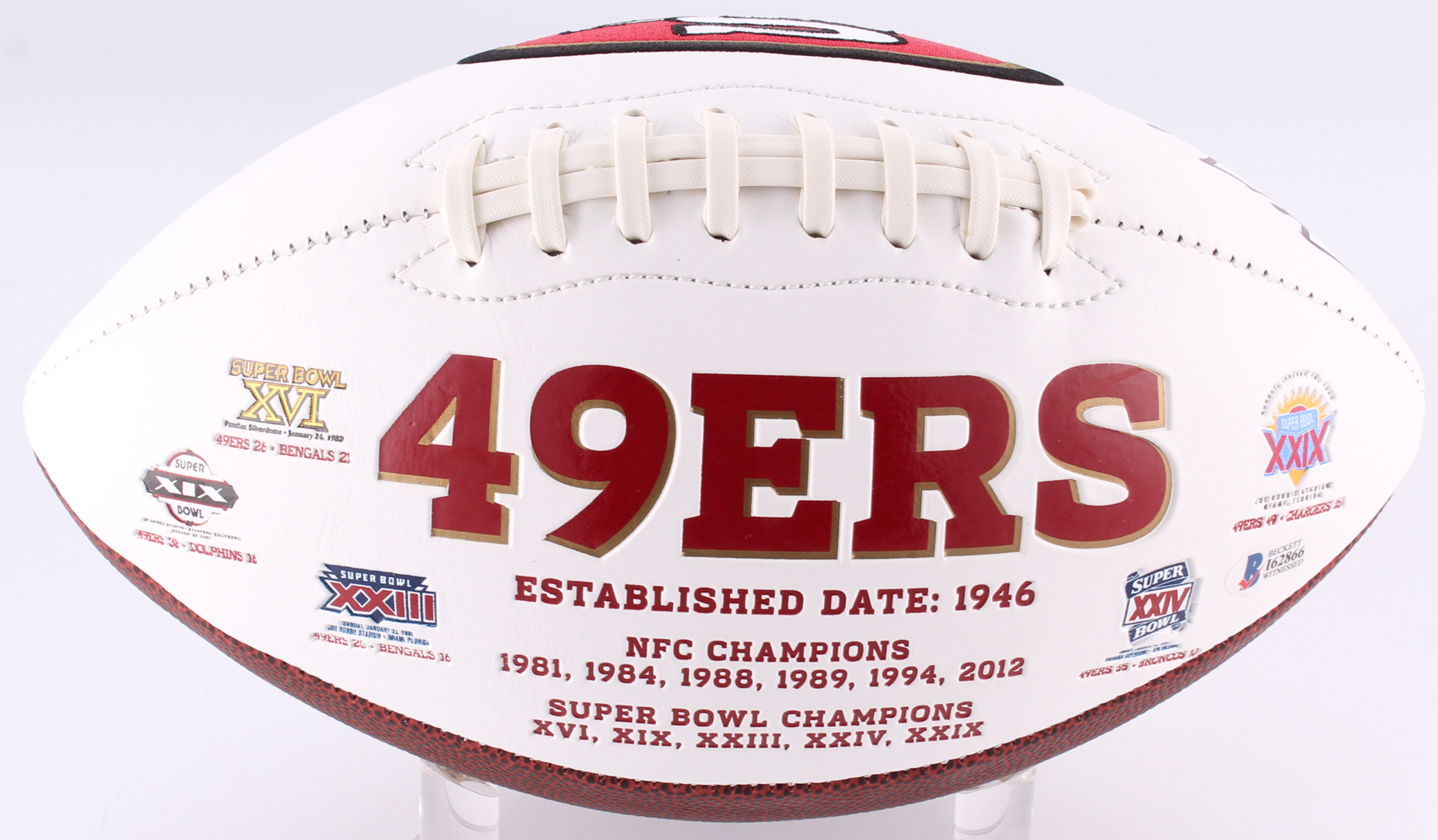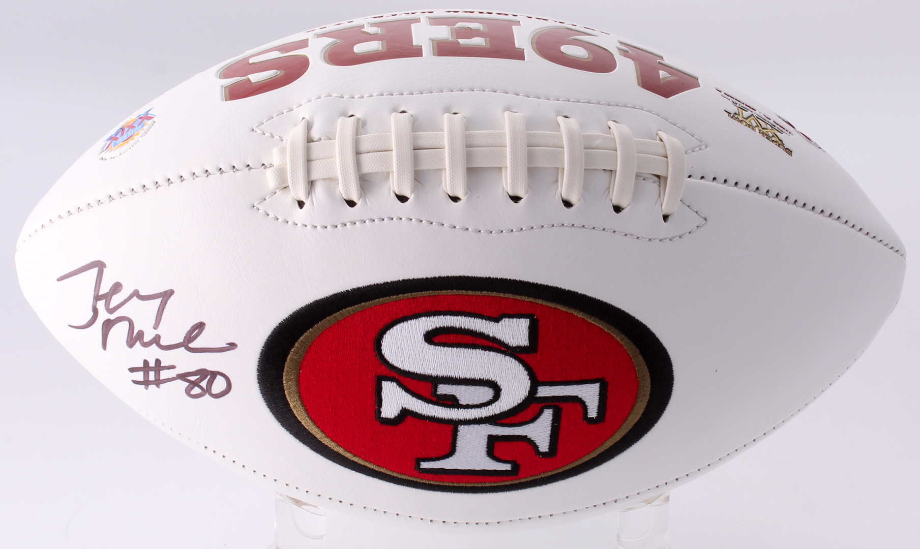 San Francisco 49ers logo football. Hand-signed in black felt-tip pen by Jerry Rice (HOF).