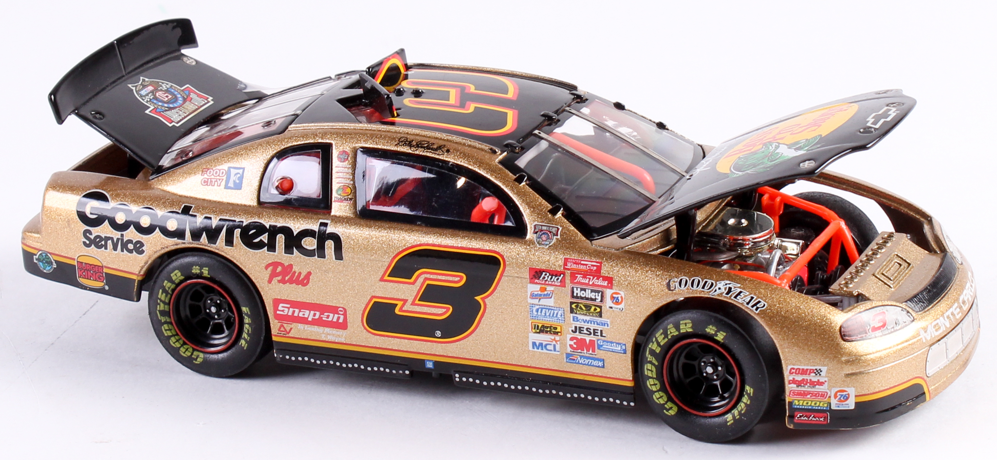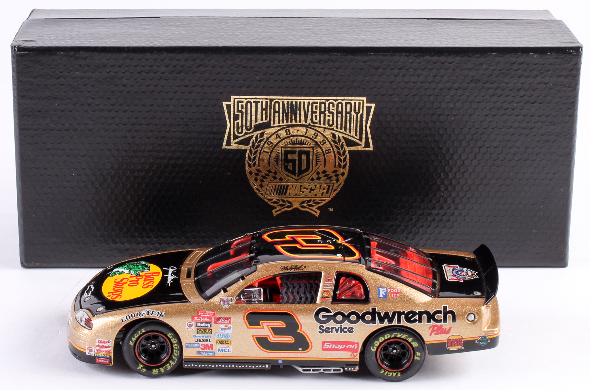 #3 Bass Pro Shops / 1998 Monte Carlo Elite 1:24 Scale Die Cast Car. Limited edition #3,367/10,000. Please note, this car is unsigned. Please also note the car comes with the original packaging. Also includes a NASCAR 50th anniversary coin.